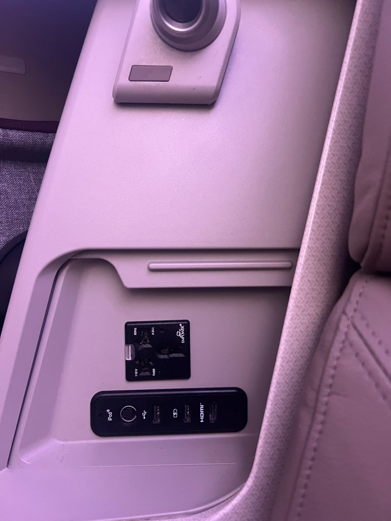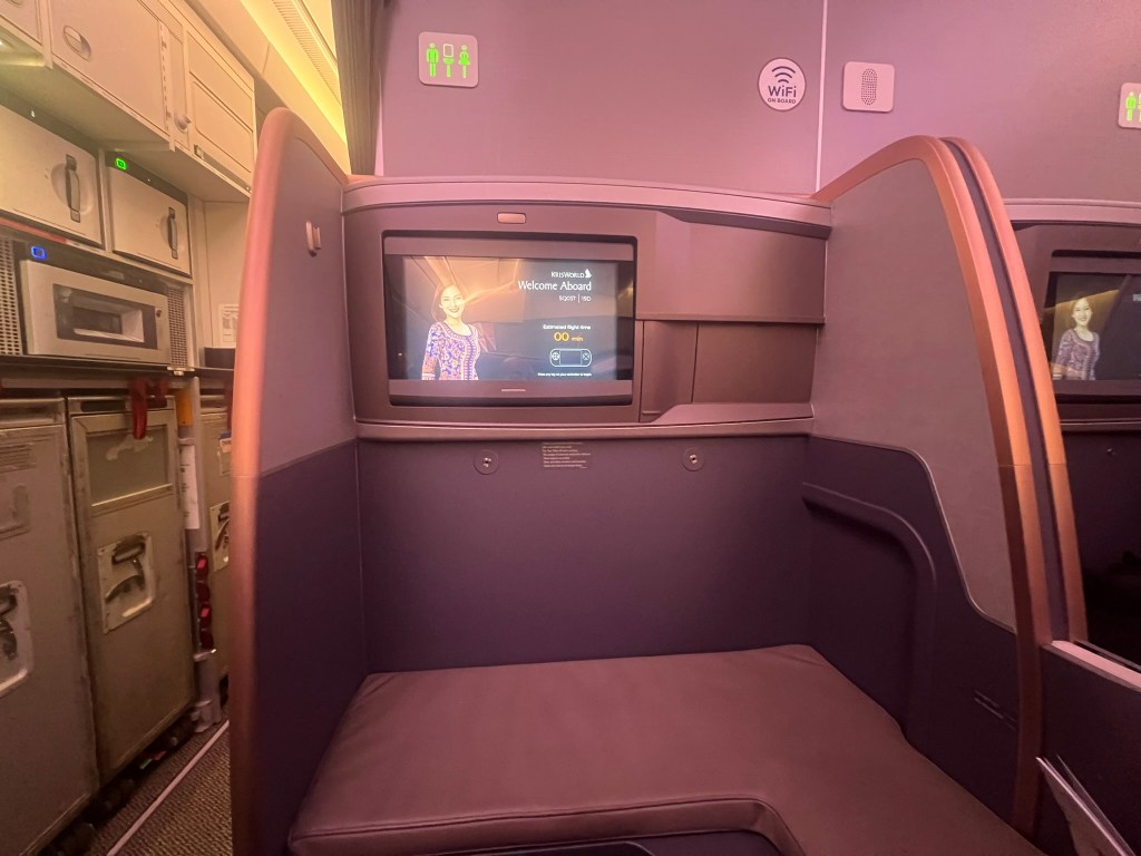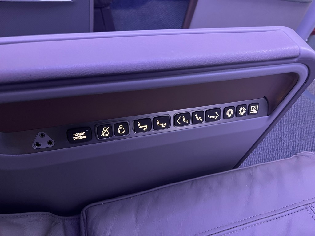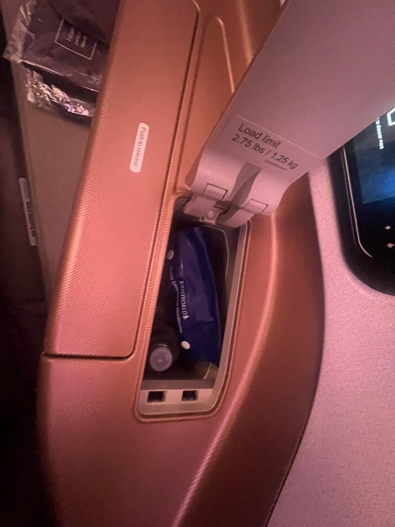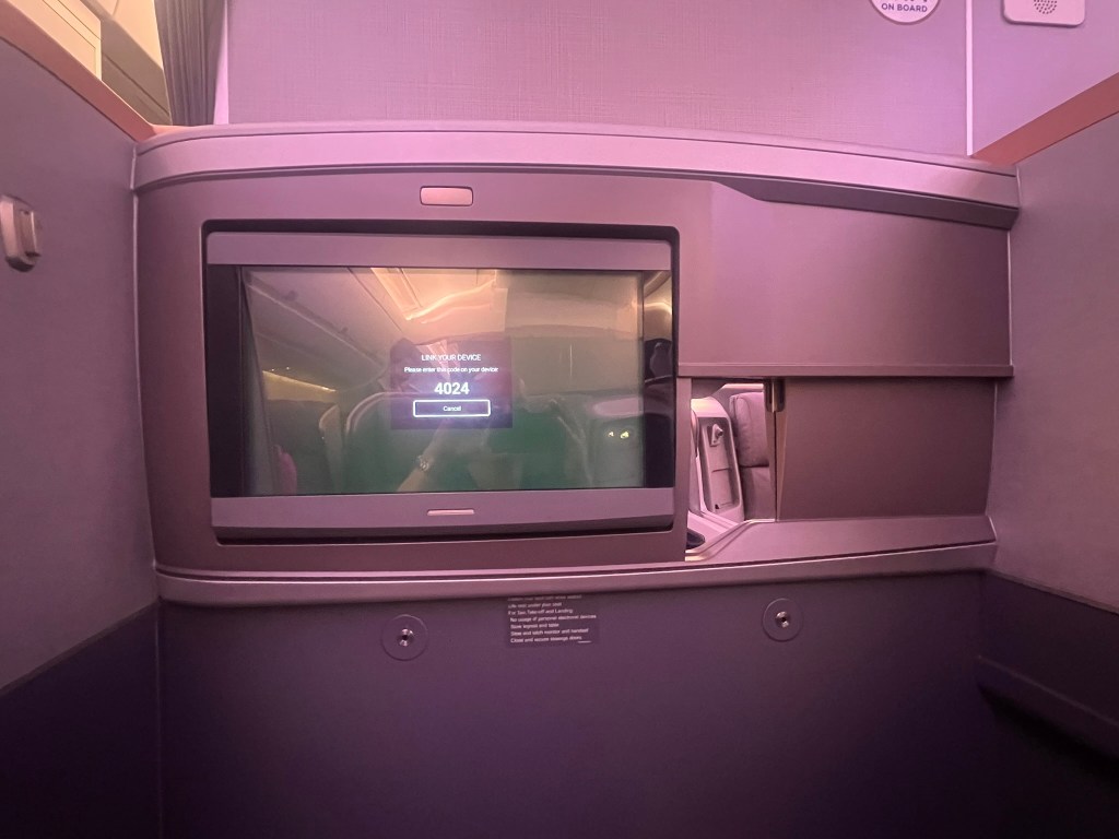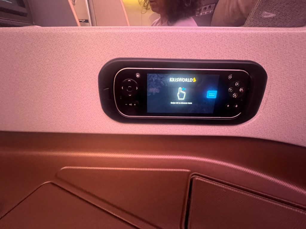We were able to pre-board because of my wife’s ankle boot, but in reality, it just meant even more time beyond the 17+ hours we were already spending on this plane. I was thankfully able to snag the bulkhead seats about 96 hours out from the flight. This makes a huge difference on the Singapore A350 because of the huge space for your feet. The seat is already very wide for a business class seat and the extra space in the footwell, particularly in the center seats, makes it so comfortable. The only minor negative is that the screen is pretty far away, too far to use the touch screen functions.