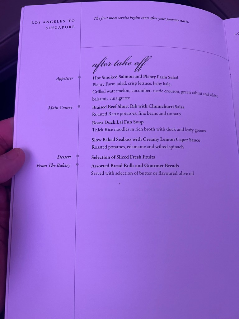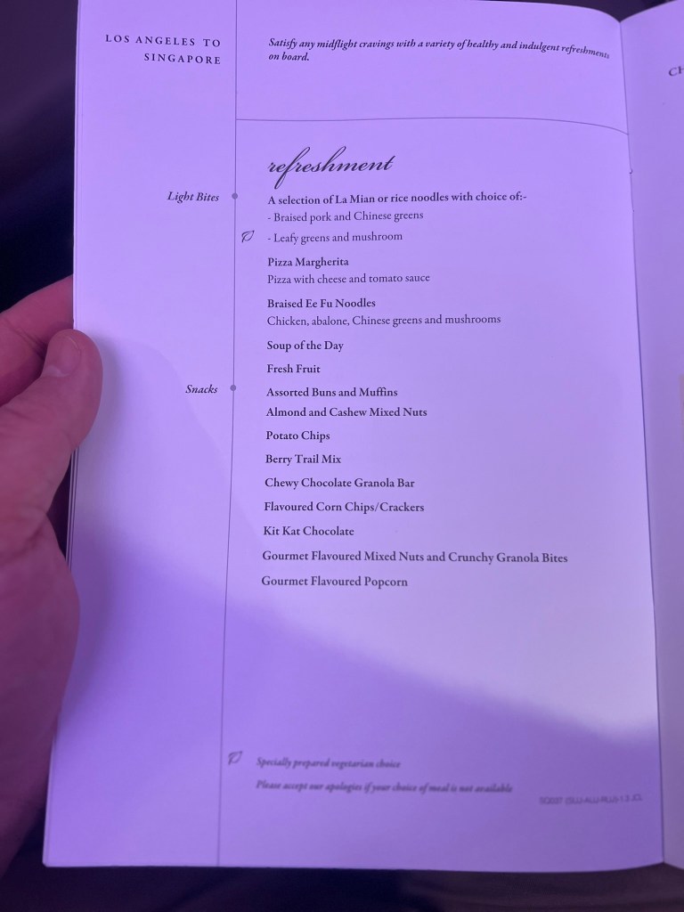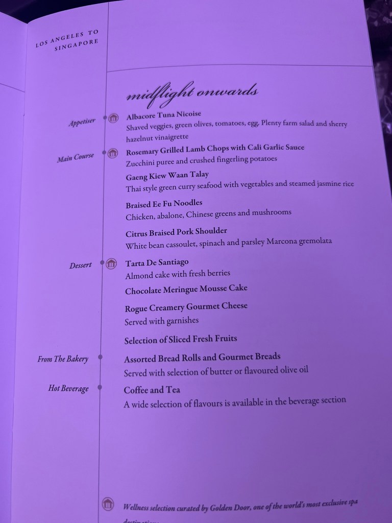 When you have a 17 1/2 hour flight, you try and plan in advance how you’re going to 1) figure out the eating and sleeping schedule and 2) get your body on the arrival time zone, which was 15 hours ahead of LAX and 12 hours ahead of the US east coast. I decided I would try and stay up for a few hours to put me closer to evening time in Singapore before trying to sleep for 5-6 hours and then I would be better able to cope with the time zone change when we landed.