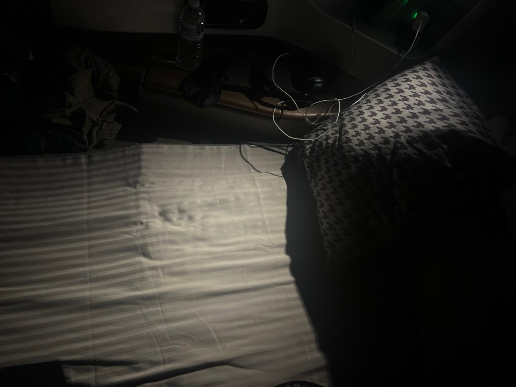 About three hours into the flight, I tried to sleep for a while. I had the flight attendant make up my bed while I went to the restroom and changed into Lufthansa First Class pajamas I had brought with me. The bed flips over so there’s a built in mattress pad and comforter already there. There’s also an extra pillow. Sorry it’s kind of hard to see in this picture as the cabin was dark.