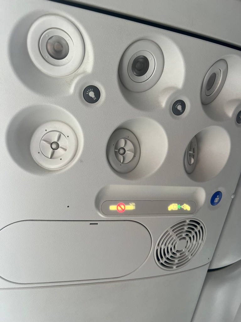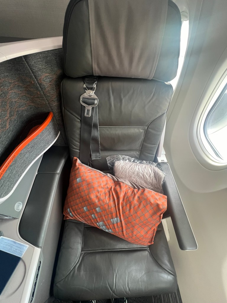 As you can see, this is a lay flat seat with a big screen and overhead air vents, which were appreciated on this warm morning in Singapore. Preflight beverages of orange juice or water were offered.