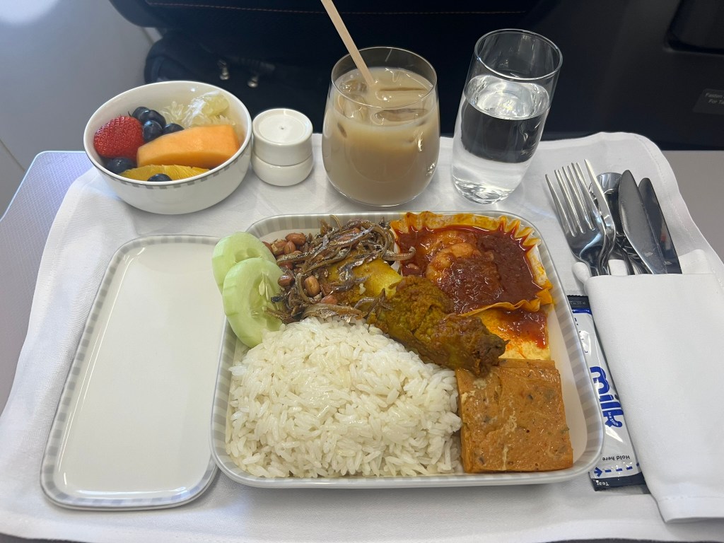 Breakfast was served after takeoff. We had both booked the cook again and ordered the Singaporean specialty, Nasi Lemak. I ordered an iced coffee to go with it.
