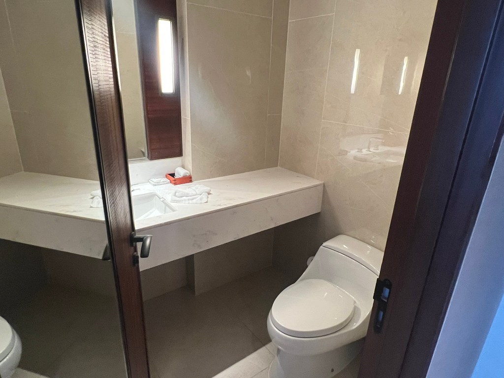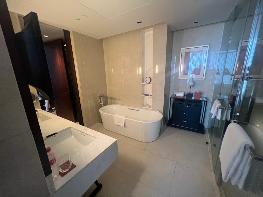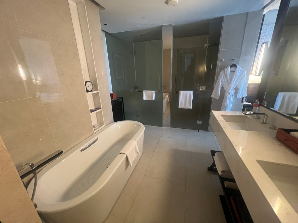There was a large separate living room, a bathroom with double sinks and a tub, a separate half-bathroom near the entrance and plenty of power outlets in this recently built hotel.