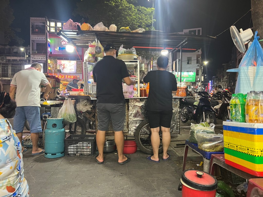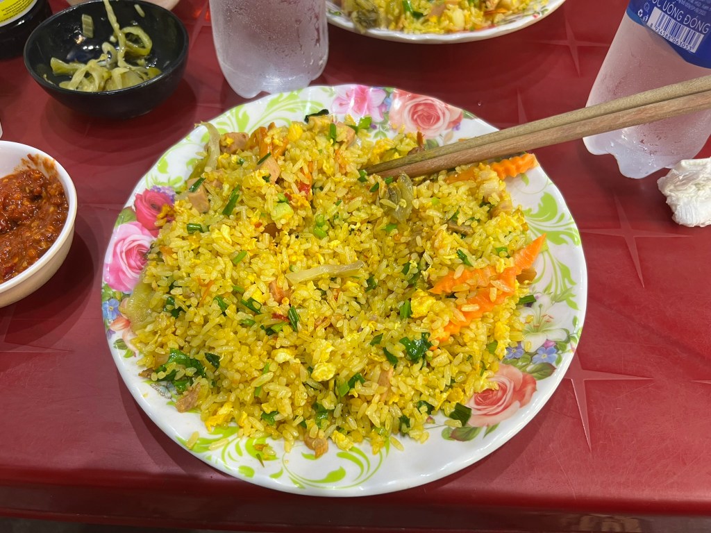 I had originally booked another food tour for that night, but as I had not yet paid, we decided to cancel it and just do our own thing. We went back to the market area in search of some street food. We found Bun Bo Hue and Com Hen, two local dishes available at stalls outside the market which were cheap and tasty. Com Hen is pictured – basically it’s seafood and rice.
