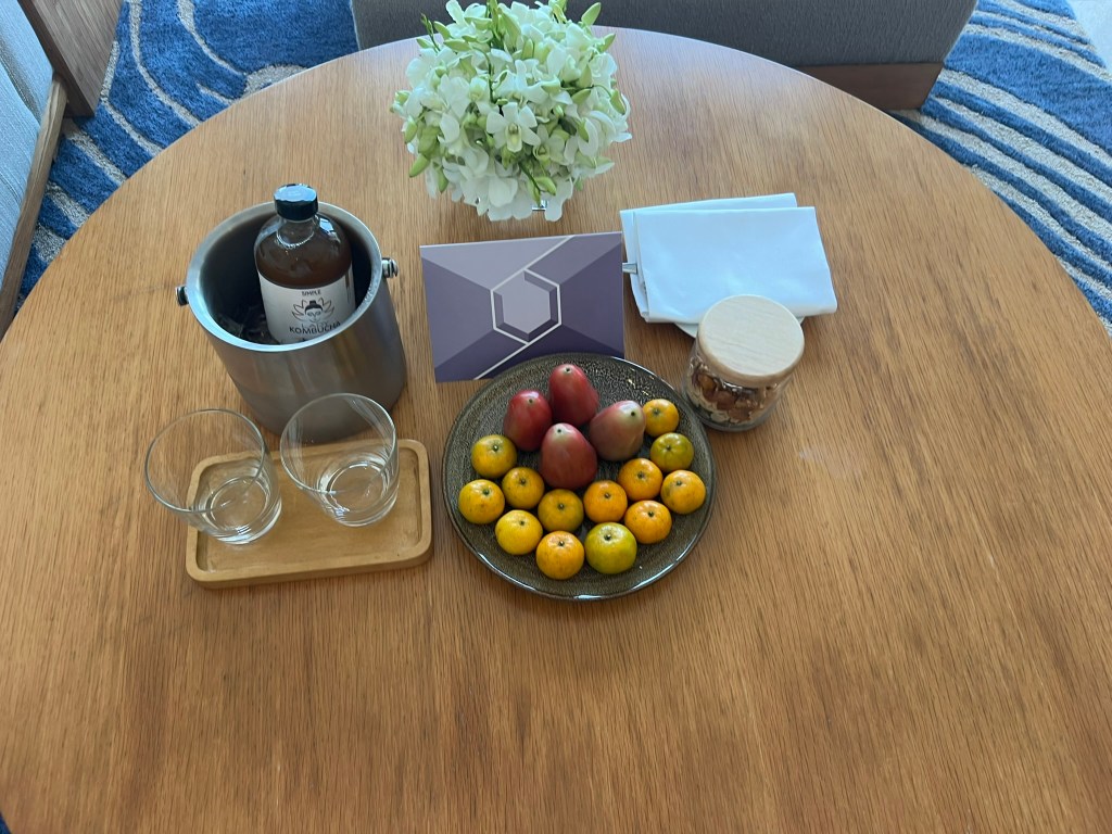 We were provided with some nice Globalist welcome gifts including Kombucha (?), fruit and nuts.