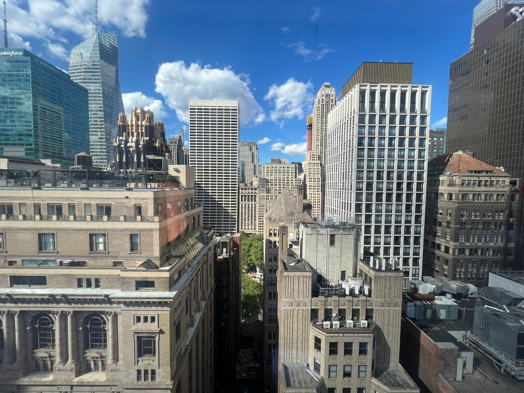 As you can see, the room was small but functional. It had a view north (so no Empire State Building) where we could see a sliver of Bryant Park and the top of a cool art deco building. Being on the 26th floor in an older, renovated building meant that we heard no traffic noise.