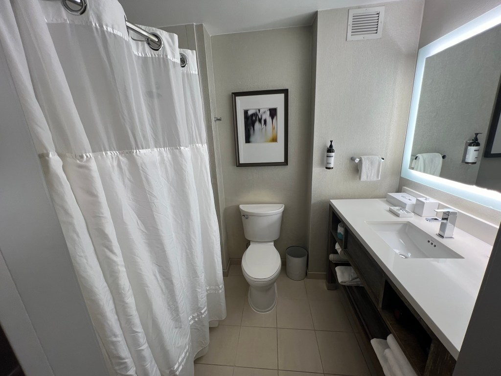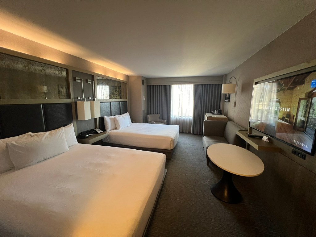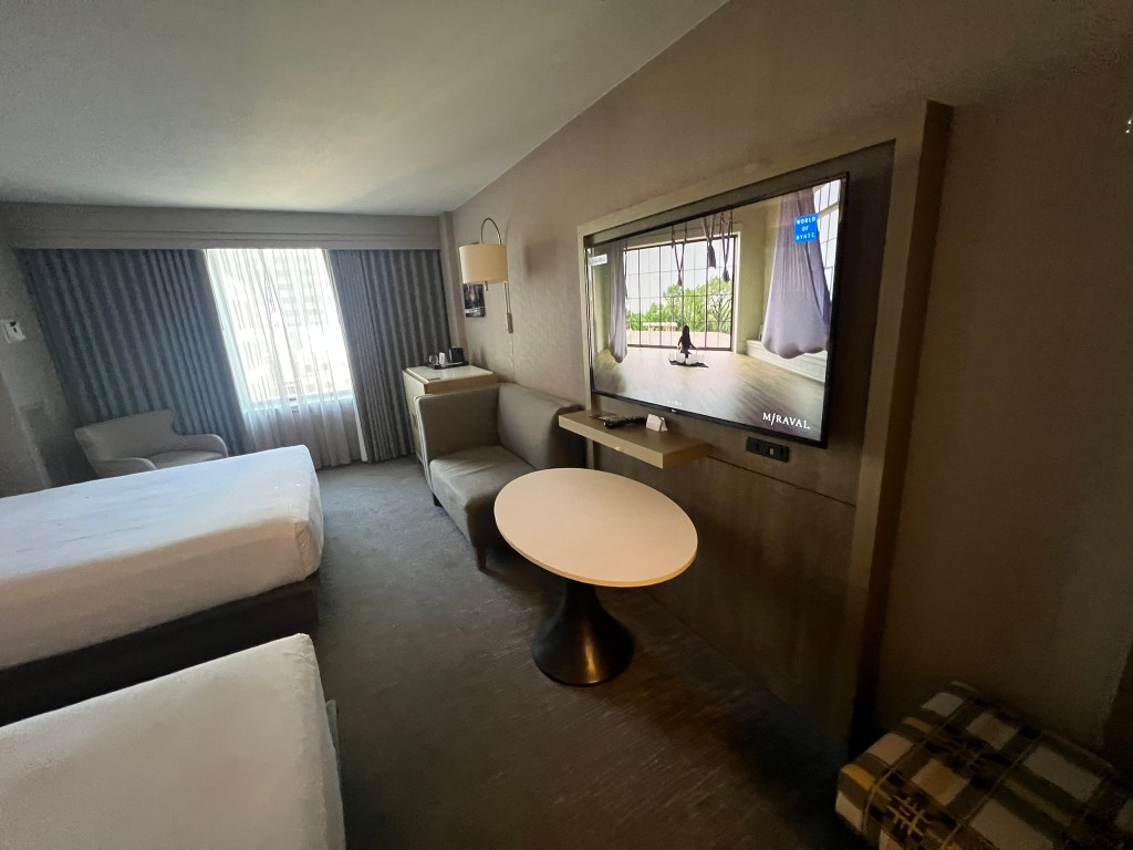 We booked a regular 2-Queen room and would have been upgraded to a 2-Queen Corner room (a larger space with a sofa) after I asked if it was available in the app chat prior to check-in. The hotel has no suites with two beds, so I didn’t bother asking about a suite. When we arrived around 3pm, our corner room wasn’t quite ready, so we just took a regular room that was ready on the 9th floor.