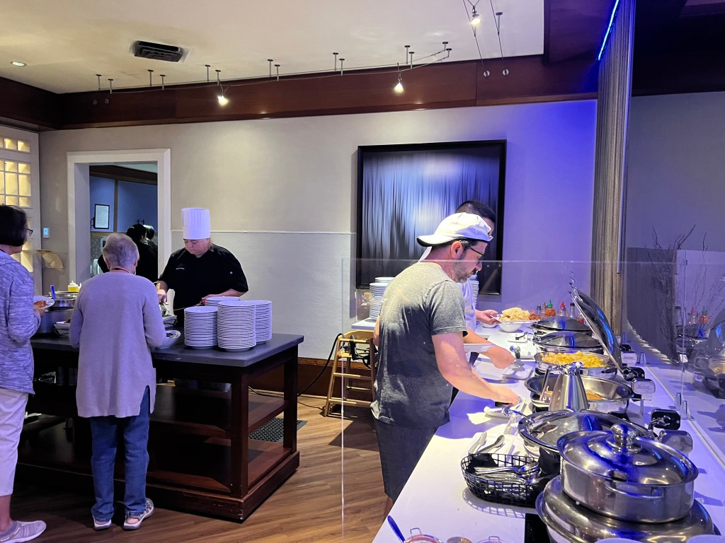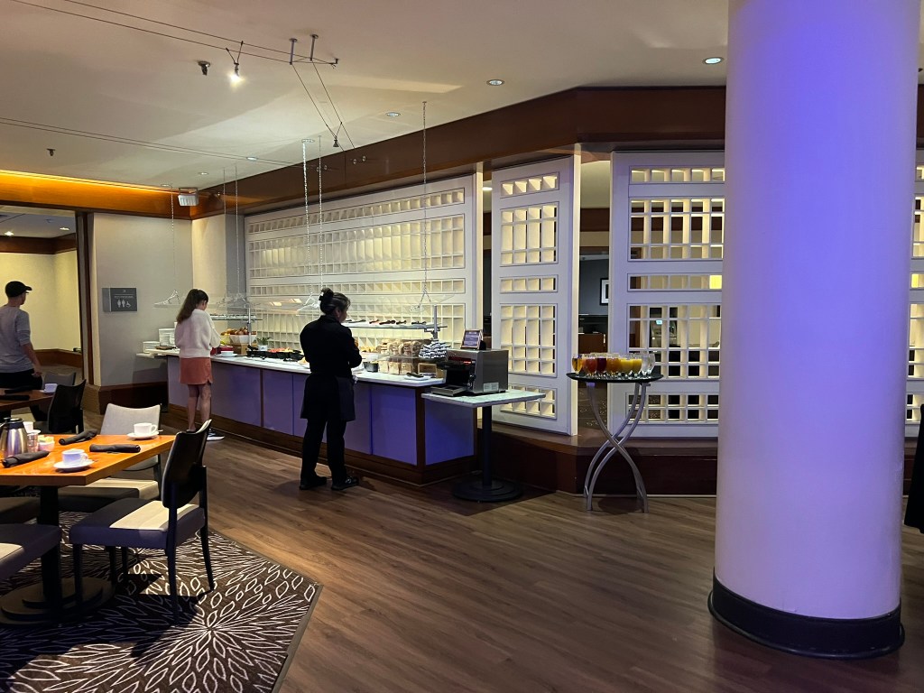 Breakfast for Globalists was limited to the buffet. There was a menu for an extra charge, but we stuck to what was included. It was actually quite good, with eggs, bacon, sausages, French toast, pancakes and oatmeal, as well as a cold bar with fresh fruit, cold cuts, breads, pastries, and yogurt. There was also a made-to-order omelet bar. It was quite busy each morning. Specialty coffee drinks weren’t included with the buffet.