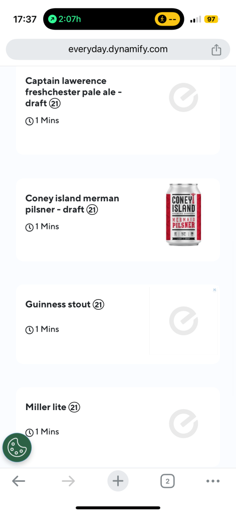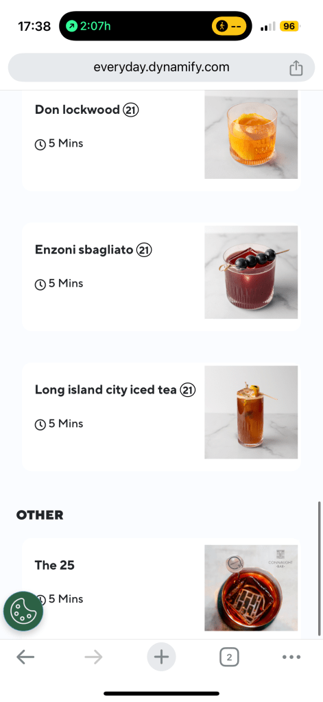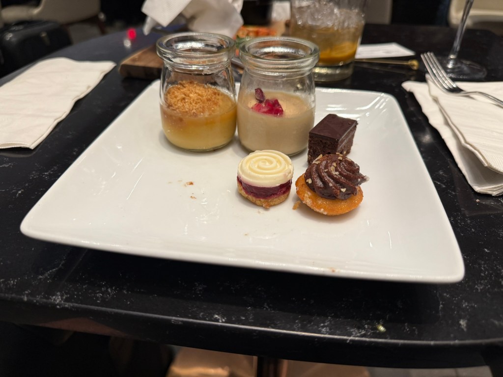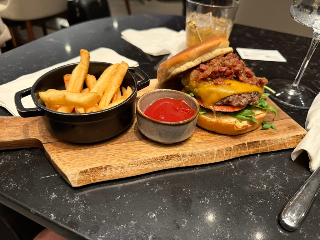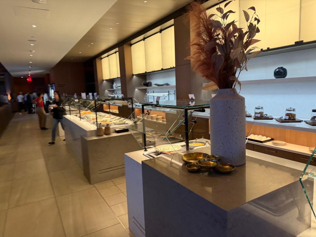 Note that you can see my time remaining to takeoff from my Flighty app at the top of my phone screen. Having made to order food is a step up from the Greenwich Lounge. I ordered the burger and fries along with The 25, a special cocktail. It turns out the special cocktail was not available so I switched to an old-fashioned. My food took a while. In the meantime, I checked out the buffet.