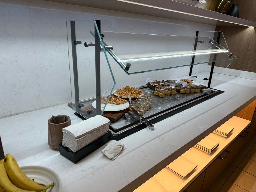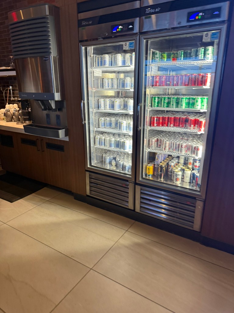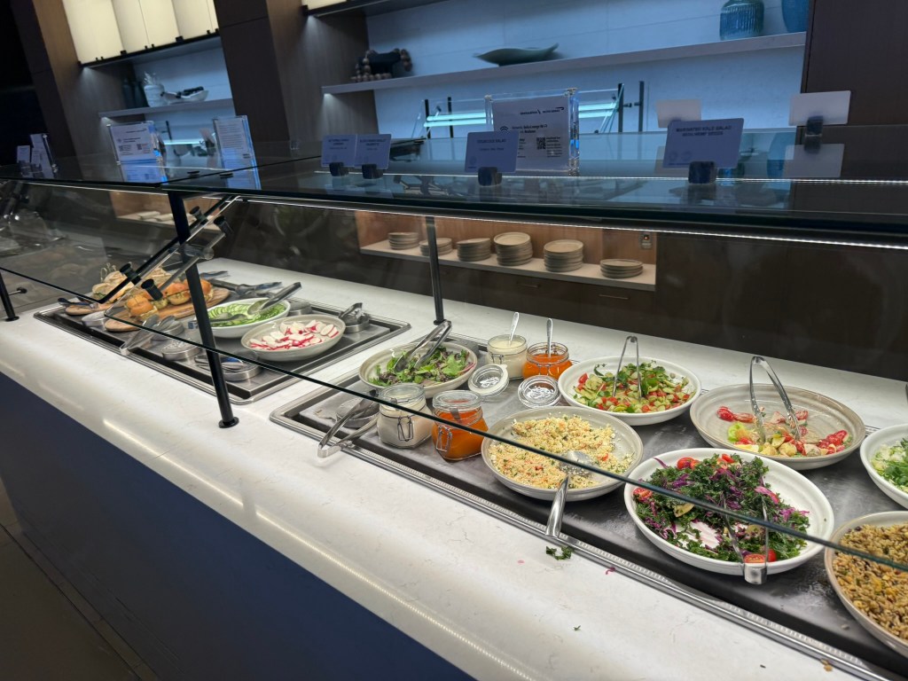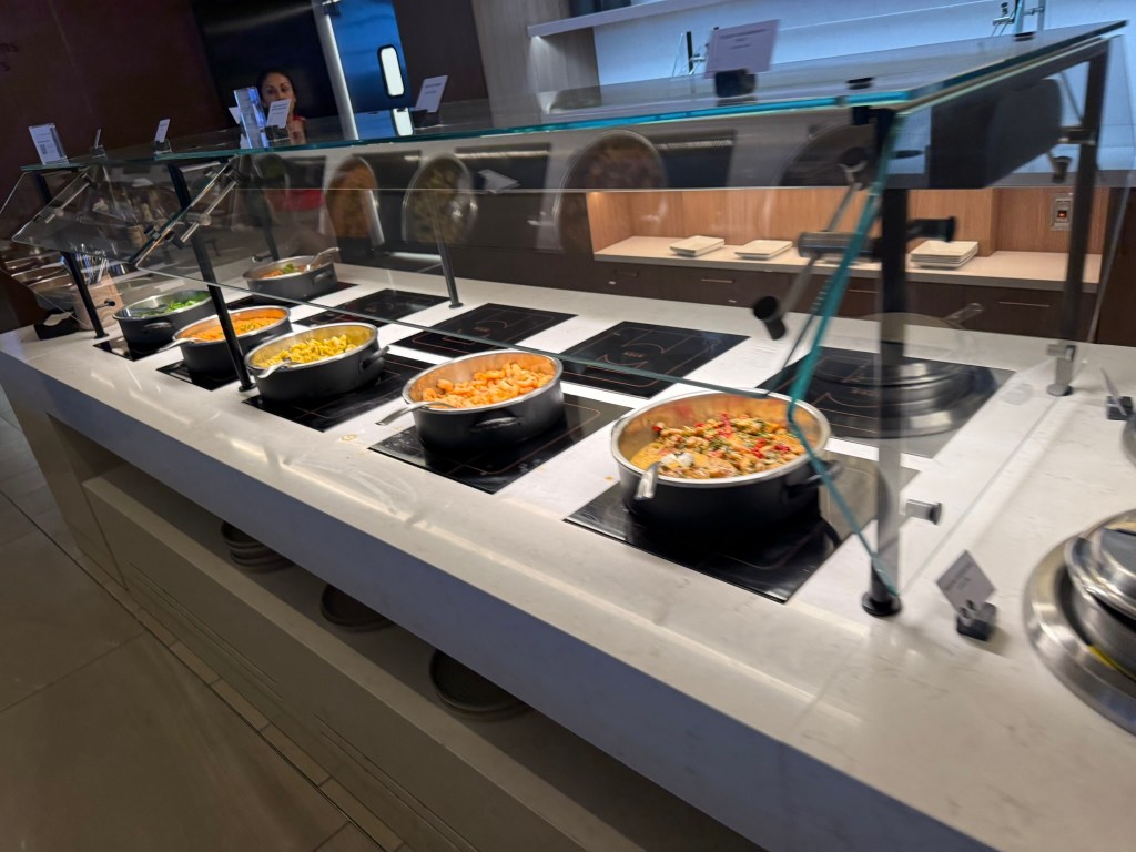 The nice thing about this lounge is that you have options. If you only have a few minutes, you can grab some food from the buffet and a drink from the staffed bar. If you have time, you can sit and order freshly made food. It’s probably easier to grab soft drinks yourself than through the wait staff.