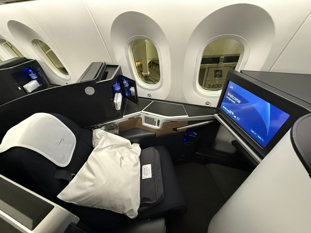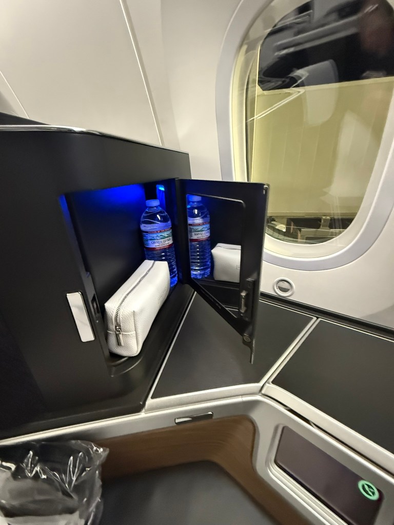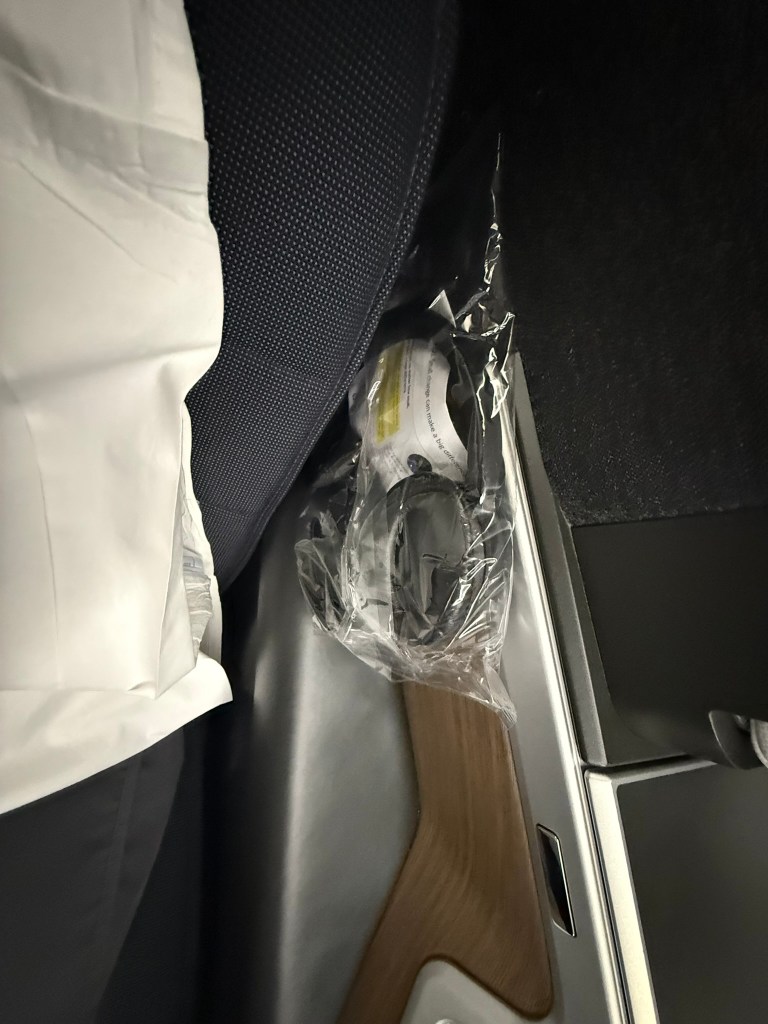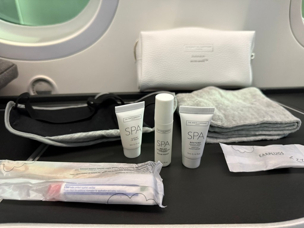I was welcomed aboard by the friendly crew and offered a predeparture beverage of orange juice, water or sparkling wine (it was probably cava or prosecco – let’s be honest here). I checked out the amenity kit which is pretty nice for a business class kit.