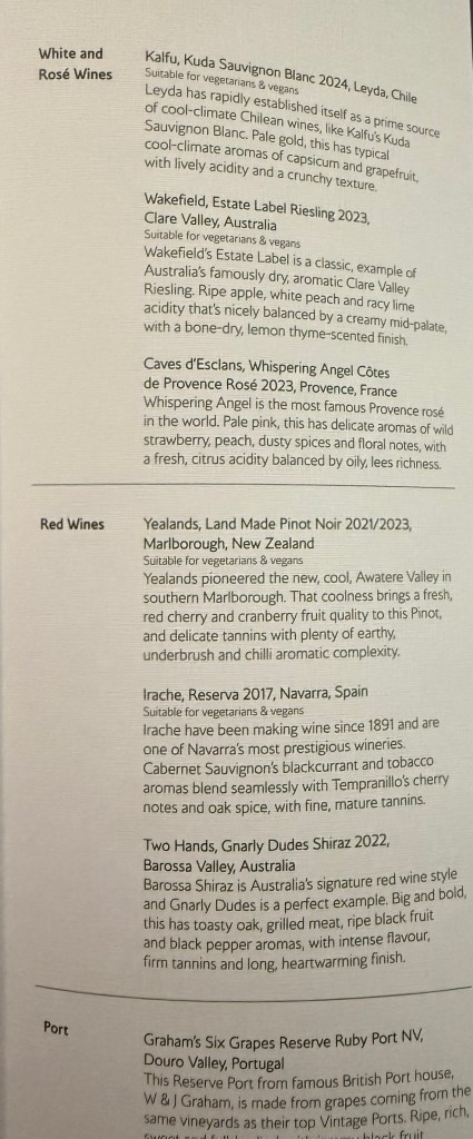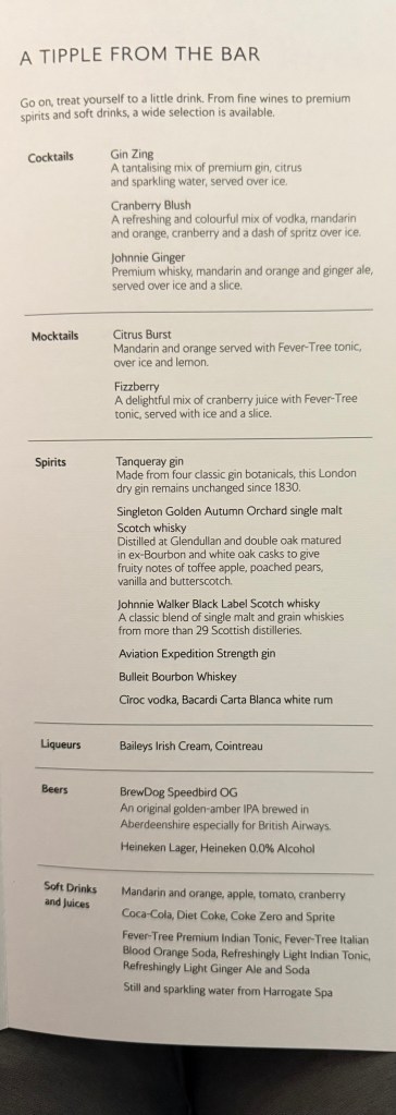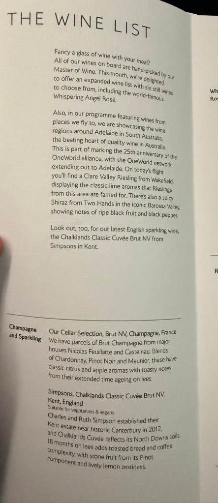 As we were taxiing out at JFK, I perused the menu. BA has cut back on meal service in business class for post 9pm overnight departures (supper service) and pre-11:30am daytime departures (brunch service) but thankfully my flight still had the full service menu. Here’s the menu and wine list.