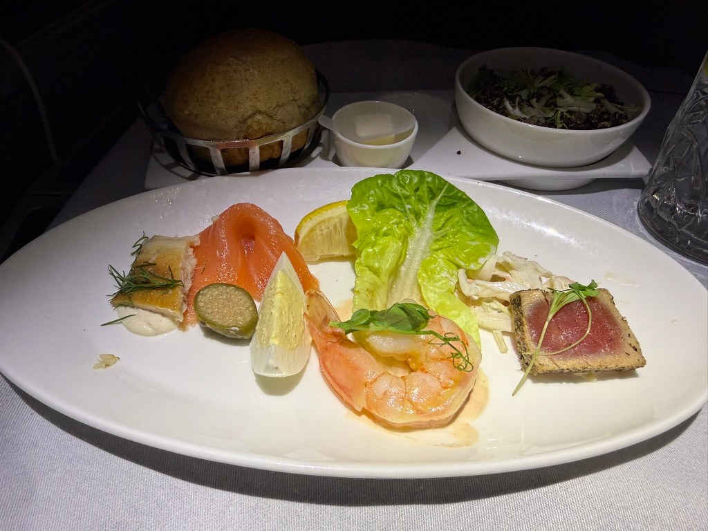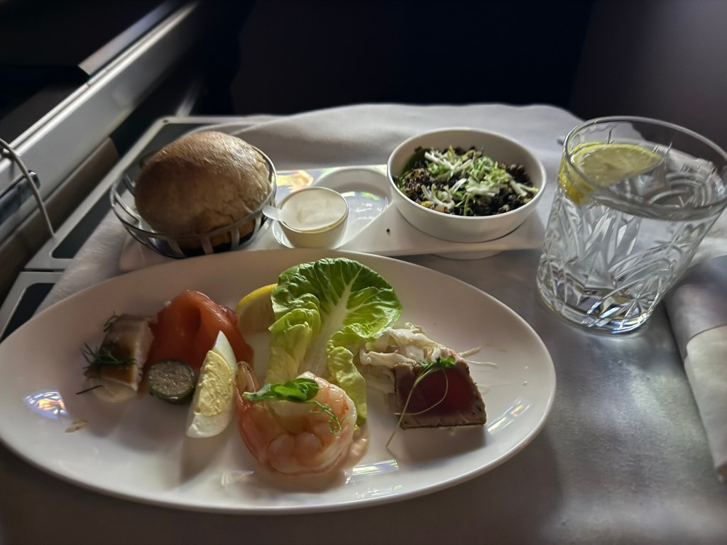 Around 40 minutes after takeoff, I received my appetizer, bread and salad. I ordered a sparkling water to go with it. During dinner, I was watching the latest season of Slow Horses on my iPad.