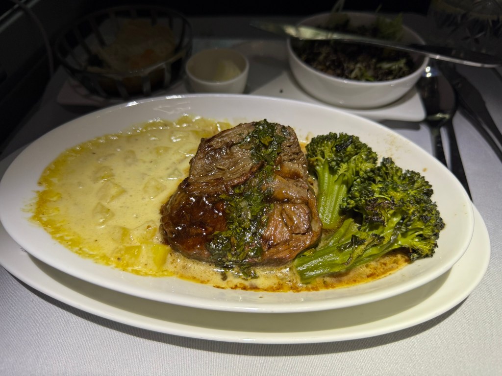 The salad was tiny, but the appetizer was good. Next up was the ox cheek and sides served about an hour after takeoff.