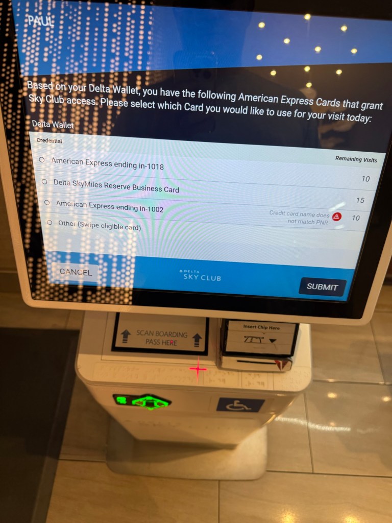 As you can see above, when I scanned my boarding pass, the system recognized both my Morgan Stanley Amex Platinum and my Delta Reserve Business cards and let me select which card to use for my visit. I’m not sure that it makes any difference which card you select, but if you’re planning on closing one of the cards before the end of the year, use up your “visits” with that card first.