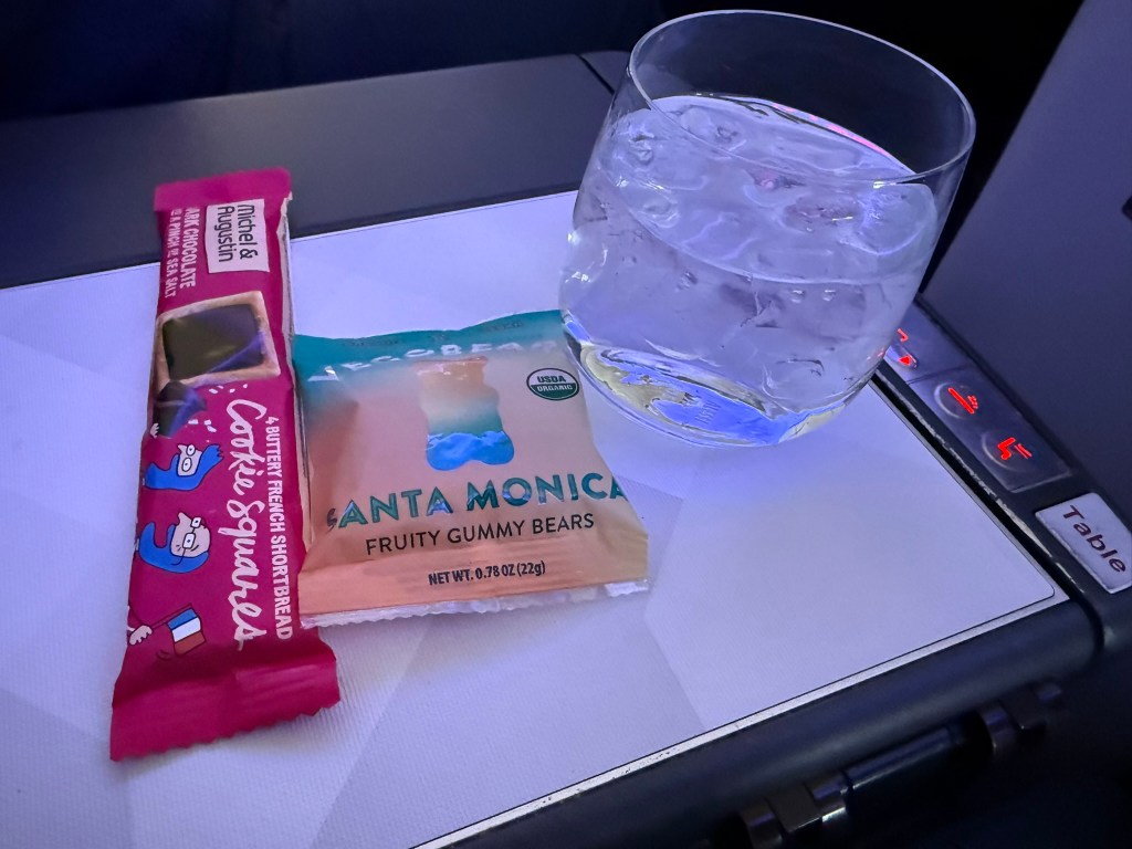 Thanks to the delay (or just lazy flight attendants), we didn’t receive a pre-departure beverage. There’s only 24 First Class seats on this plane so not many more than a A321neo. There’s no excuse not to serve us a drink while the rest of the aircraft boarded.