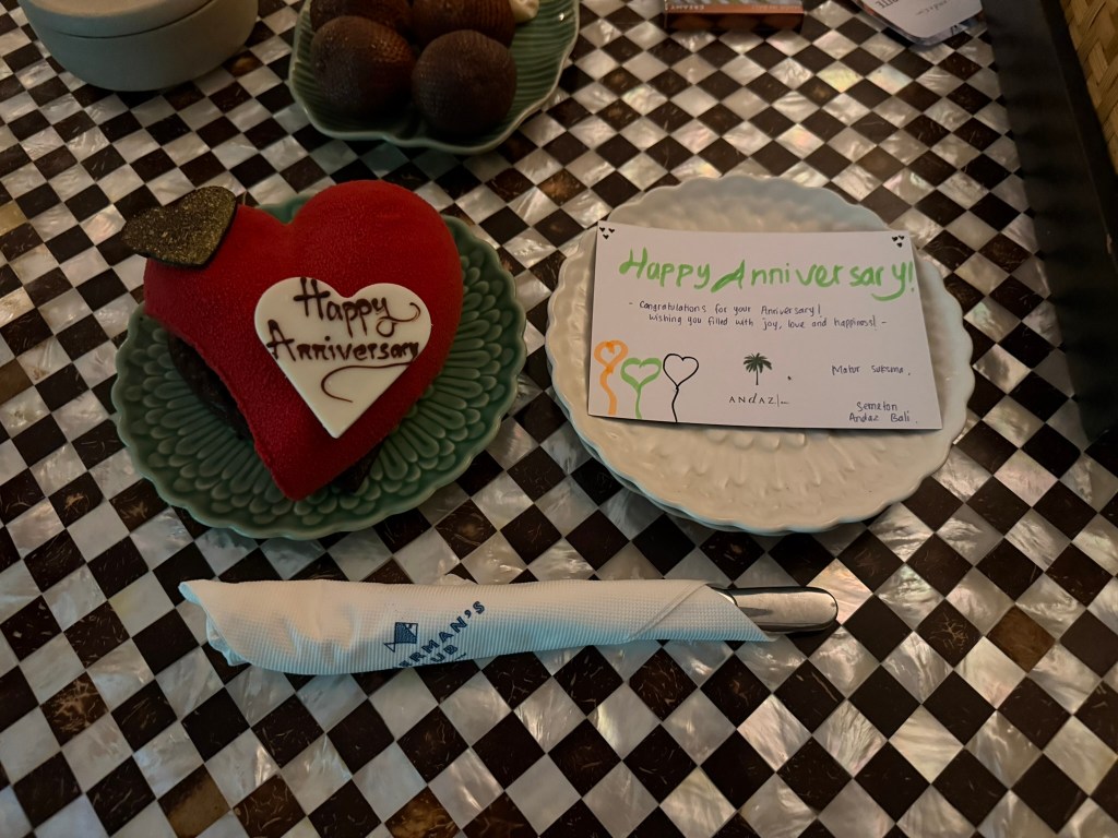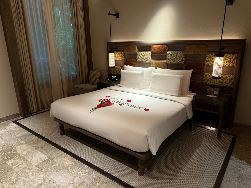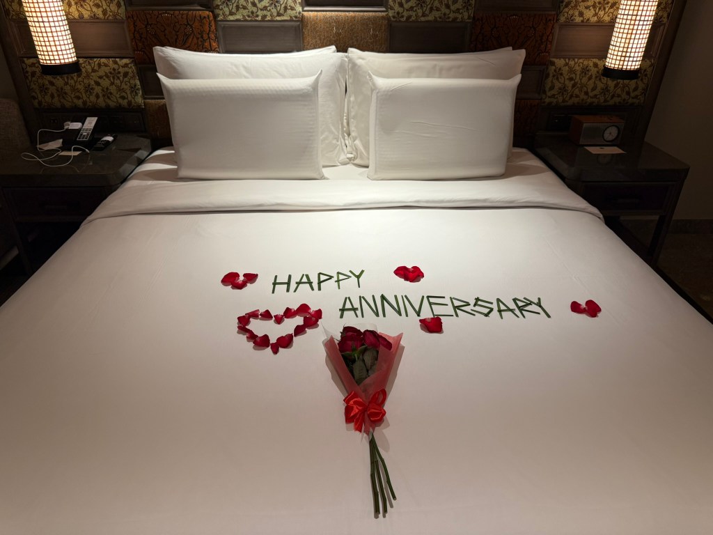 We were provided with several welcome gifts and a nice display on the bed wishing us (early) happy anniversary.