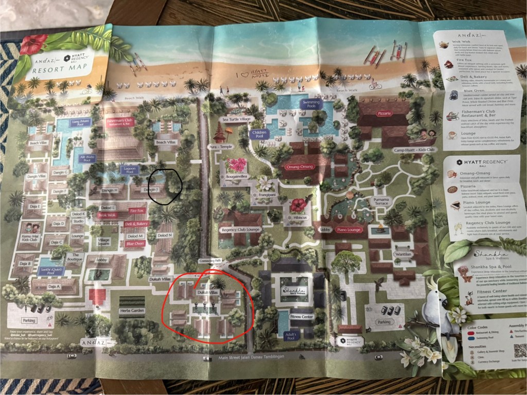 This map of both the Andaz and Hyatt shows our villa circled in black and the larger pool villas circled in red. You can see how far away they are from the beach. I was glad we ended up with a lagoon villa. The names in red are all the restaurants.