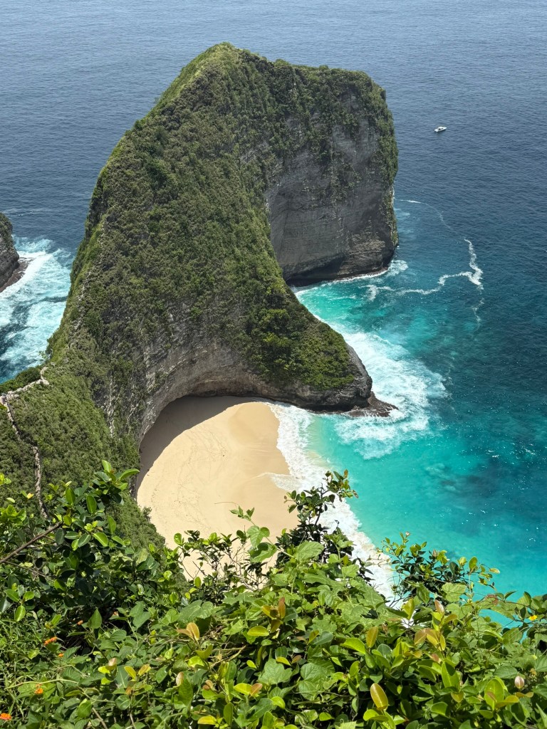 From there, we headed about 40 minutes on a very bumpy road over to Kelingking Beach which is on the opposite side of Nusa Penida. Once there, we only had about 20 minutes, so there was no way to hike down to the beach which takes at least 30 minutes each way. It’s famously known as T-Rex Beach because of the shape of the cliffs. You can see the trail down to the beach on the left. They are building an elevator (yes, an elevator) down to the beach which should be ready in a year or so and will guarantee that the traffic to and from this spot will get even worse.