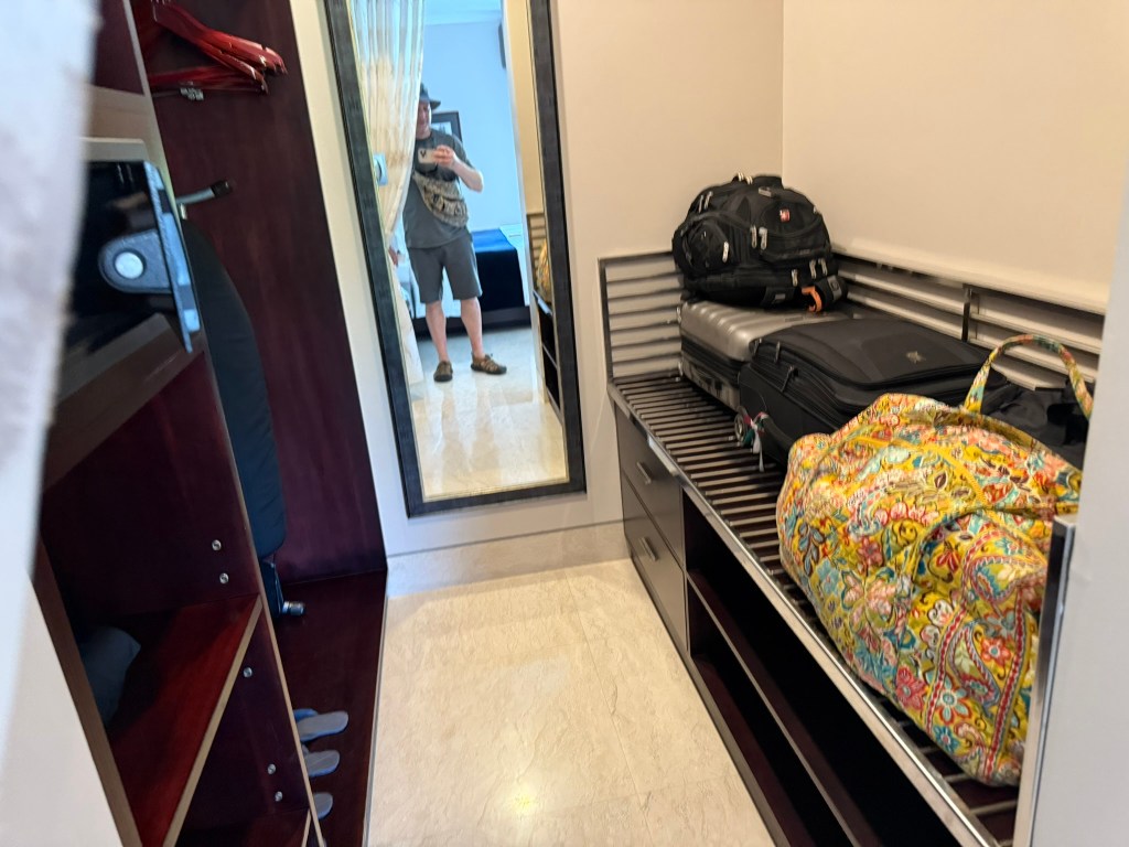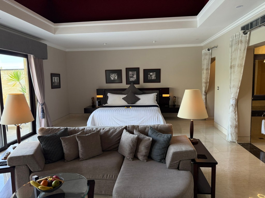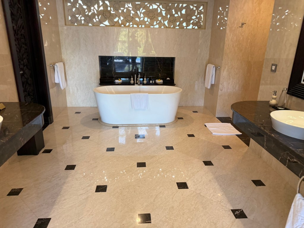 I think we were upgraded to a higher category villa as my wife is a Diamond member and we booked through her Hilton account. The villa was basically one huge room with a beautiful private pool. The bathroom had a large tub and shower and separate W/C. There was a small closet to the side near the bed.