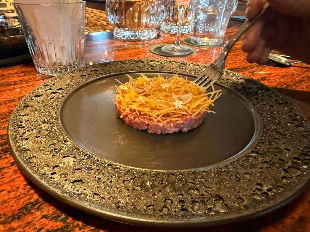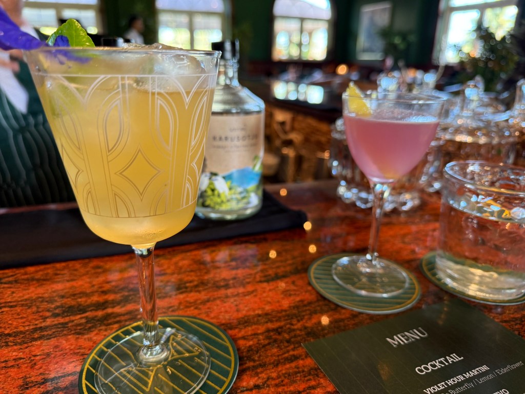 There is a higher-end restaurant on property called Aperitif. While we didn’t eat there, we did visit the neighboring bar, Pinstripes, for their free cocktail hour on Thursday and Saturday (it’s also on Tuesdays). There was a limited menu for the free cocktails, but it included canapes, which were varied and delicious.