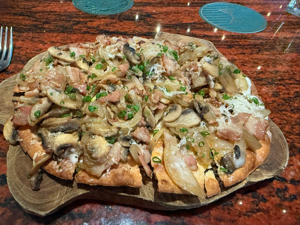 We ended up just eating dinner at the bar both times we visited. My wife loved the beef tartare and burger. I enjoyed this mushroom, bacon and onion flatbread.