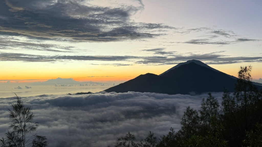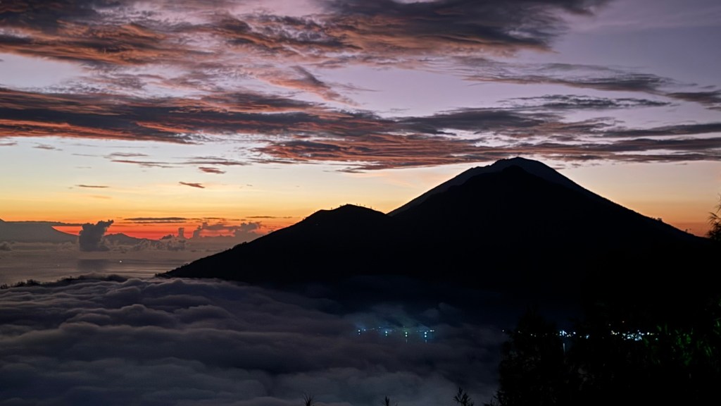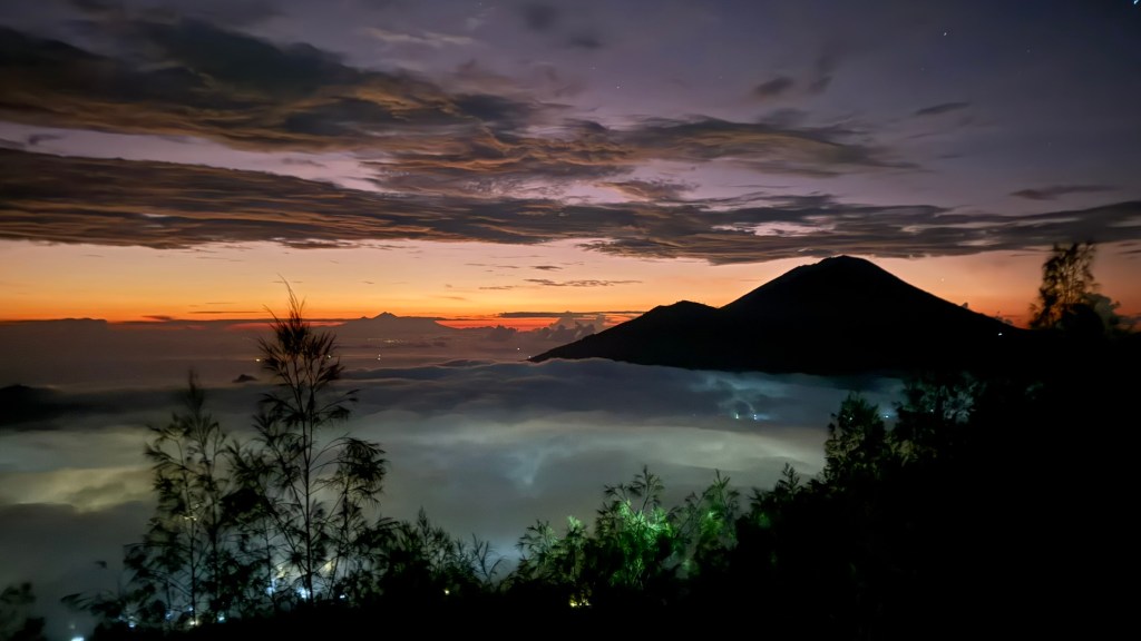 We just sat and caught our breath while we watched the light appear behind the two mountains just in front of us, Mount Agung and Mount Abang.
