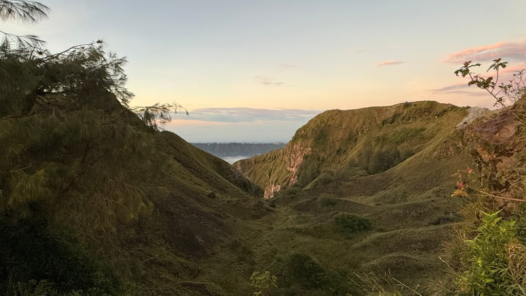 Once the sun was up, we hiked up a bit further to the top of the caldera. There were steam vents up there where they had boiled the eggs for our breakfast. There were also some monkeys.