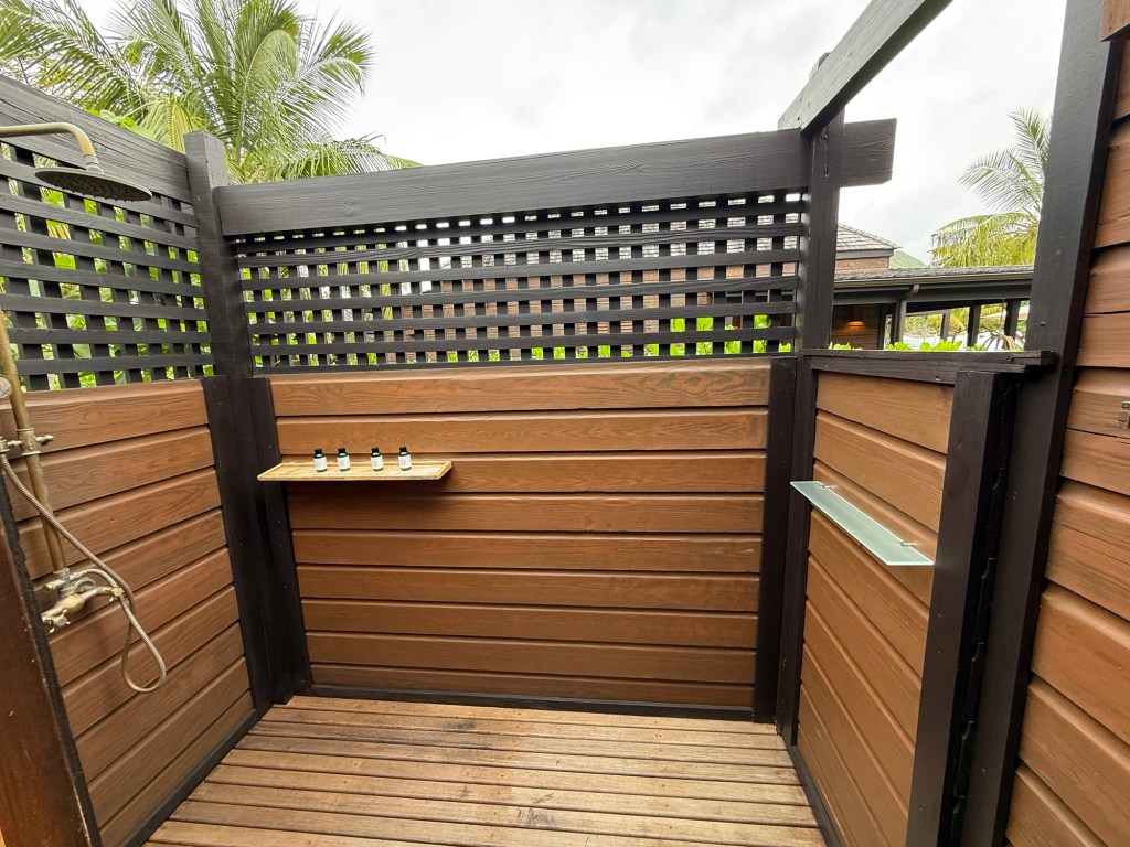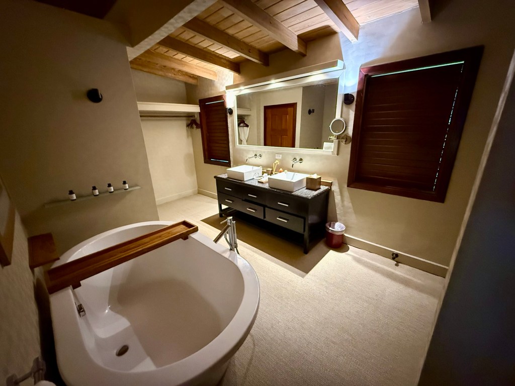 The bathroom was behind the bed and there was no door (just an opening) since the A/C vent was in the center of the ceiling of the main room. There is an outdoor shower which is on the right side of the unit when facing it from the beach. We had a renovated unit with a separate W/C which I had requested before we arrived. There were double sinks and a big bathtub (which we didn’t use other than to hang our wet bathing suits on.)