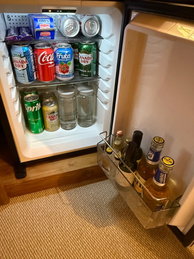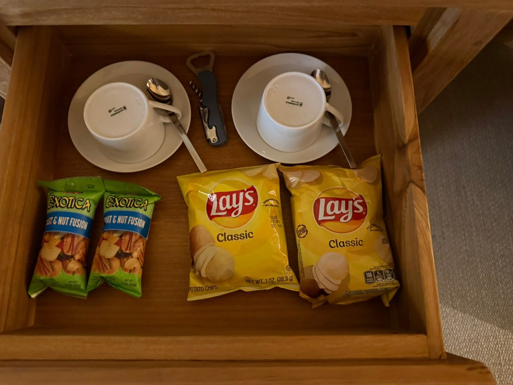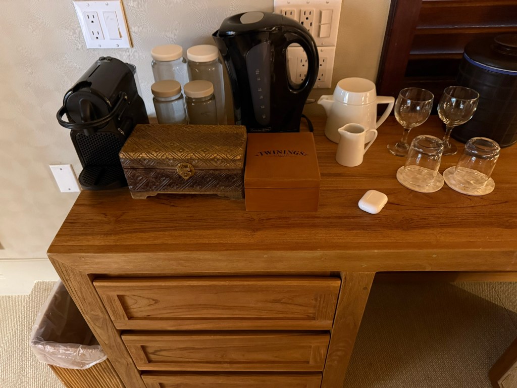 There was a minibar plus snacks and coffee/tea facilities on the right side of the bed. We didn’t use the minibar much as we were close to the main restaurant and bars. I could see using it more if I was in a hillside villa which is more of a pain to get down and back up from.