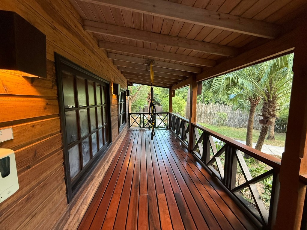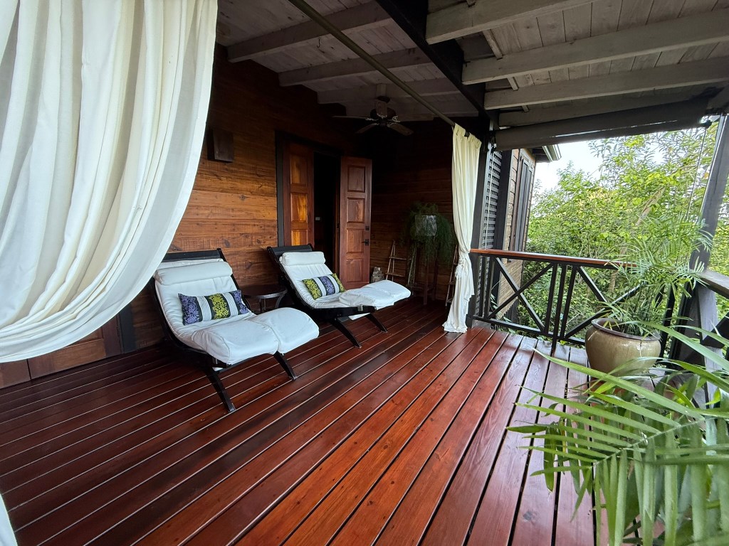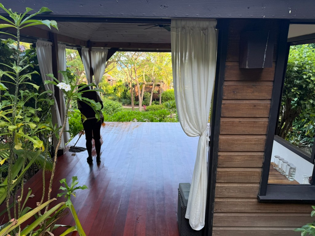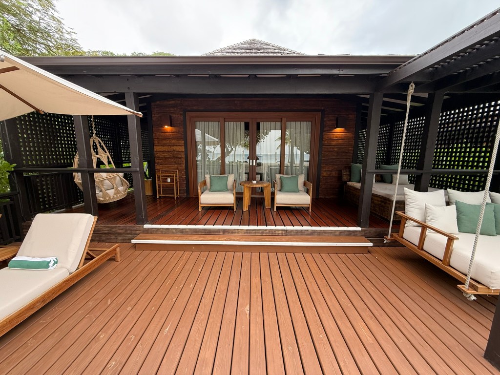 As you can see, there were tons of seating options including two loungers, two chairs and a table, a swinging day bed, a fixed day bed and a swinging chair. There was seating for at least nine or ten people. There’s also a foot wash visible in the bottom right of the picture. Here’s a better view of the seating.