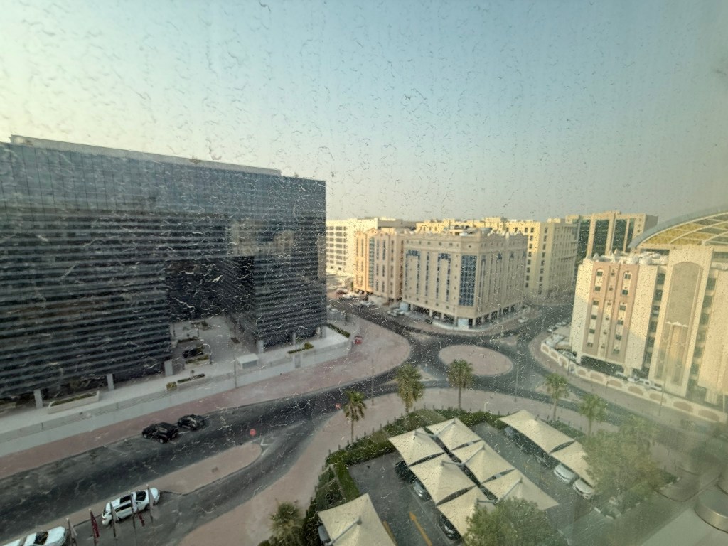 I slept quite well for about five hours, which was probably the most uninterrupted amount of sleep I got on this trip. Here’s the view from my room in the morning with a dirty window: