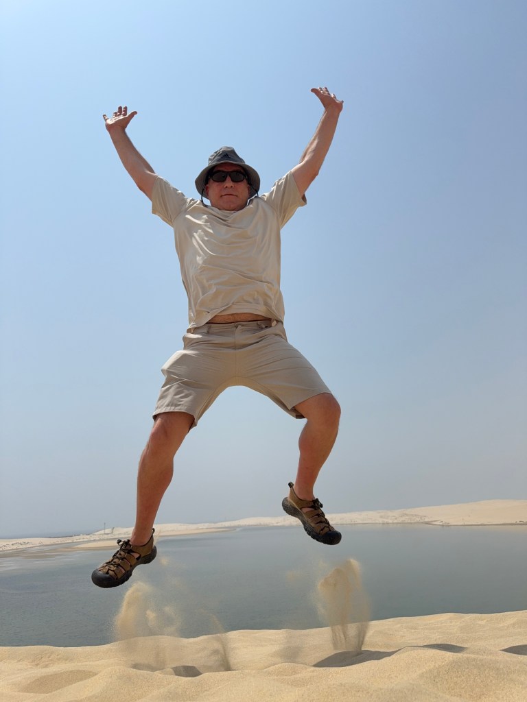 We stopped at the top of a large dune and our driver brought out a sandboard, which basically looked like a snowboard. I gave it a try, but the sand quickly came over the lip of the board and oh by the way, I was wearing sandals and the sand was really hot! It felt like I burned my toes and I had to pour a bottle of water over my feet to cool them off. Here’s a funny picture the driver took at the top of the dune.