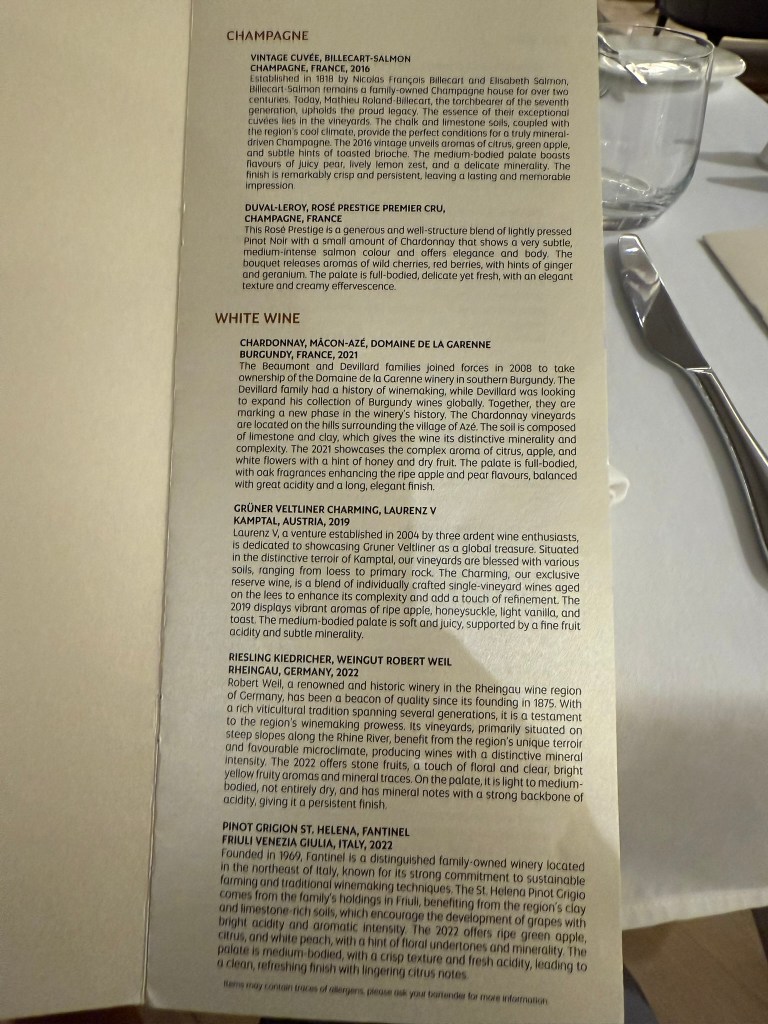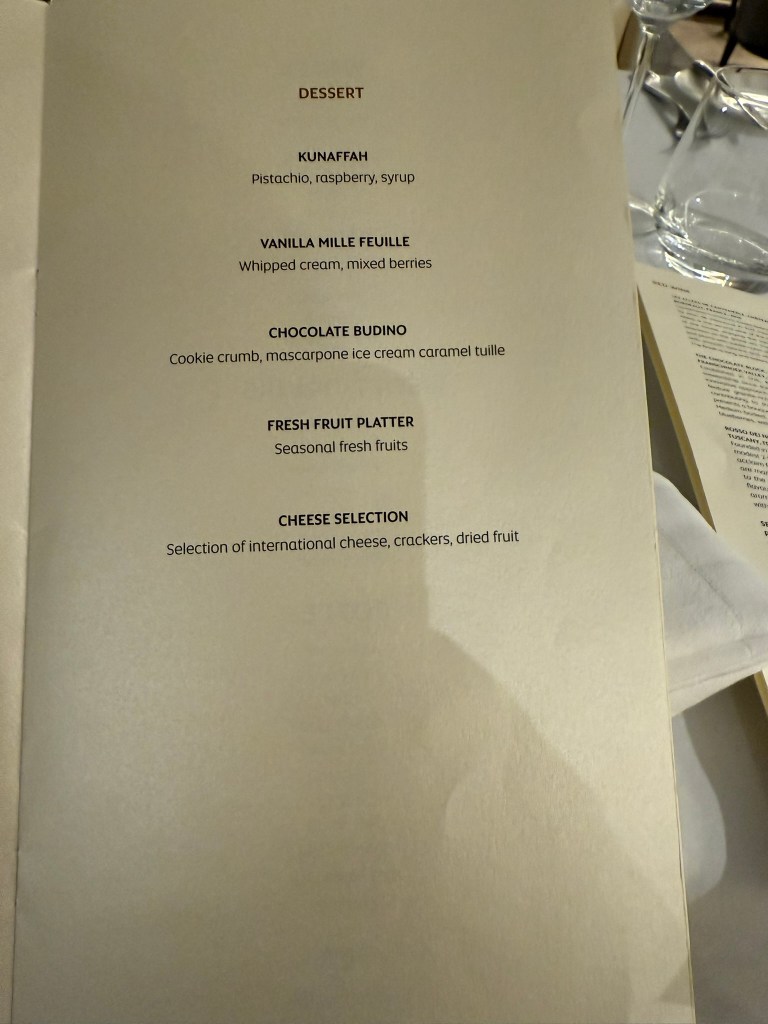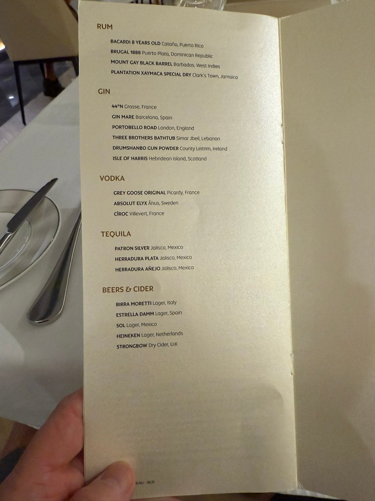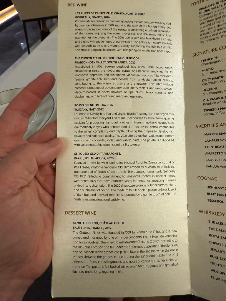 As I moved over to a nearby lounge chair, my waiter followed me over and asked if I wanted to try another whiskey that was off-menu, the Macallan Enigma. It was excellent and should be as it’s priced at well over $300 a bottle, in the range of the Dalmore King Alexander III served by Emirates.