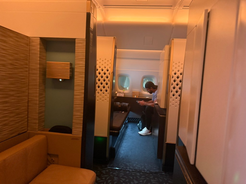 Unfortunately, my gate was not one of the two attached to the Etihad First Class Lounge so I walked over to the gate with a Canadian couple who were on my flight. About a week before this flight, I had noticed that there was only one other person in the cabin with me, but by the day of the flight, the seat map had 7/9 seats filled. The couple told me that they had been offered a reasonable price to upgrade from business class so they decided to splurge for the Apartments on their way home.