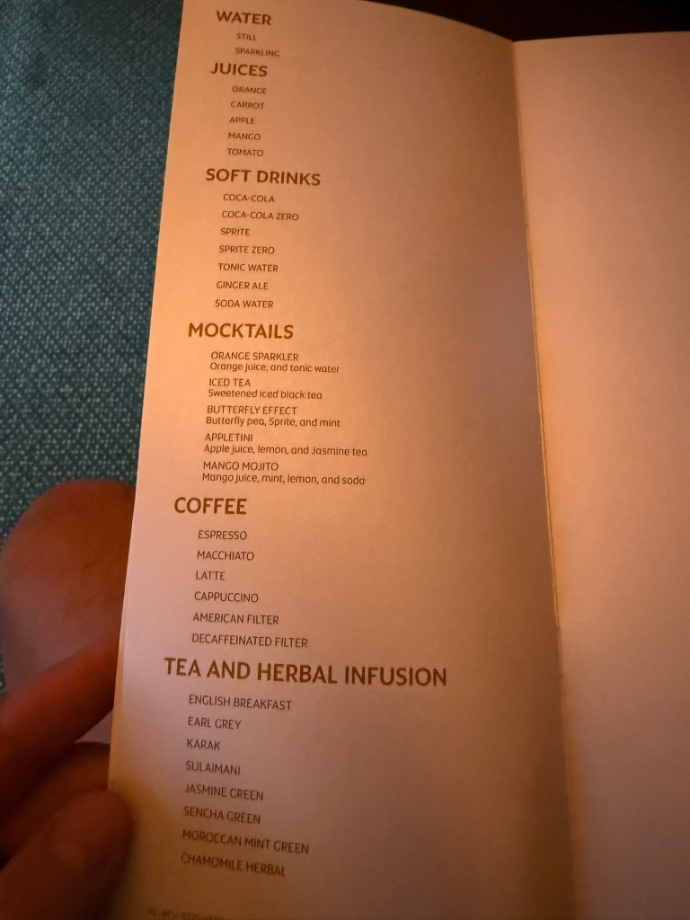 I realized after the flight that I never checked out the lounge area which is behind First Class and shared with Business Class. There’s not a bar there like on Emirates and Qatar so I didn’t make it a priority. I expect our departure time didn’t help either.