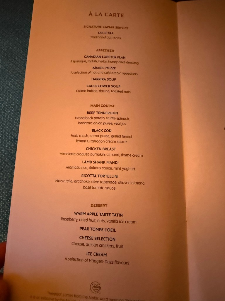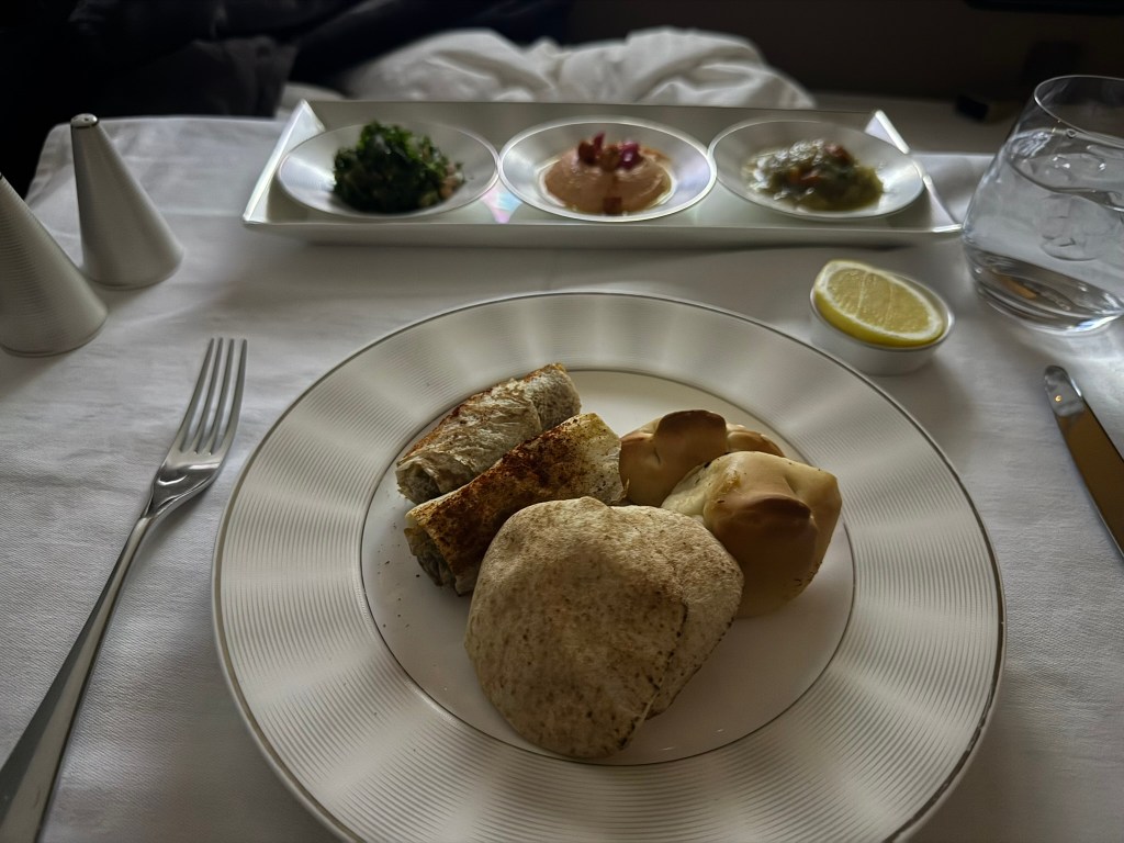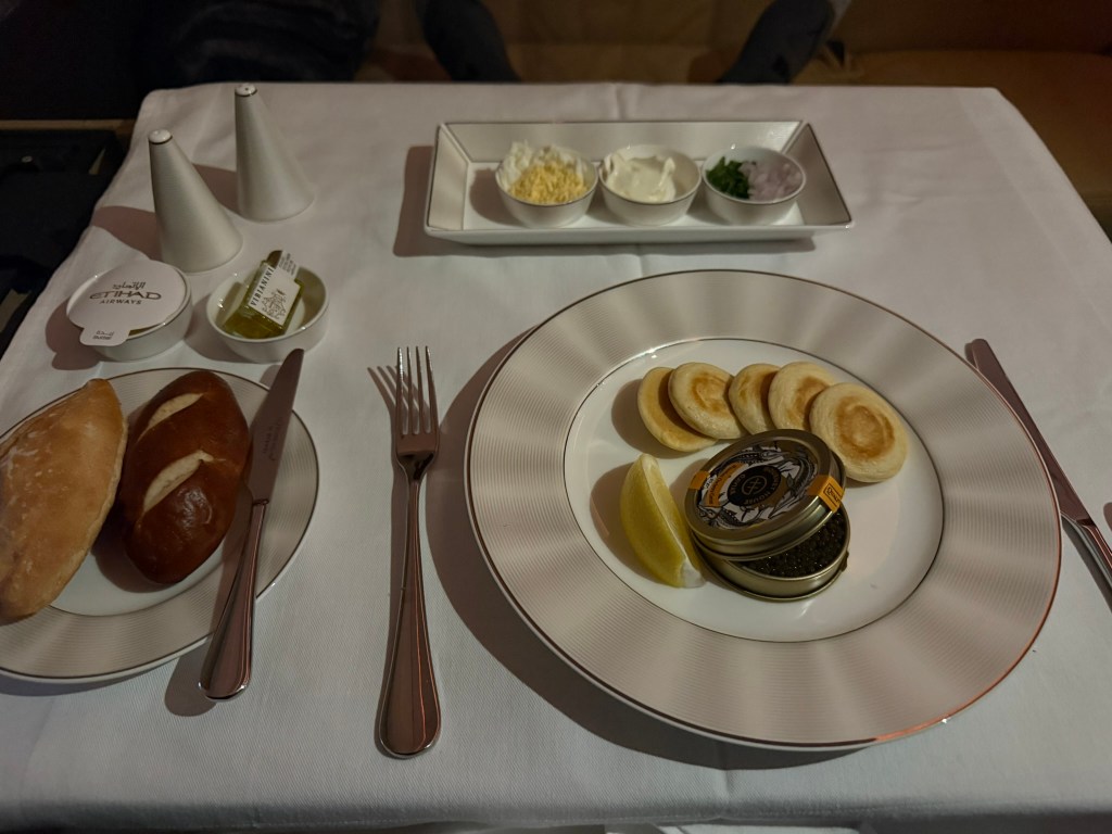 Now it’s caviar time, Etihad style. I enjoyed the caviar, but the blinis were very stale. I’ve read other reviews that said the same. It’s a shame because everything else was very nicely presented.