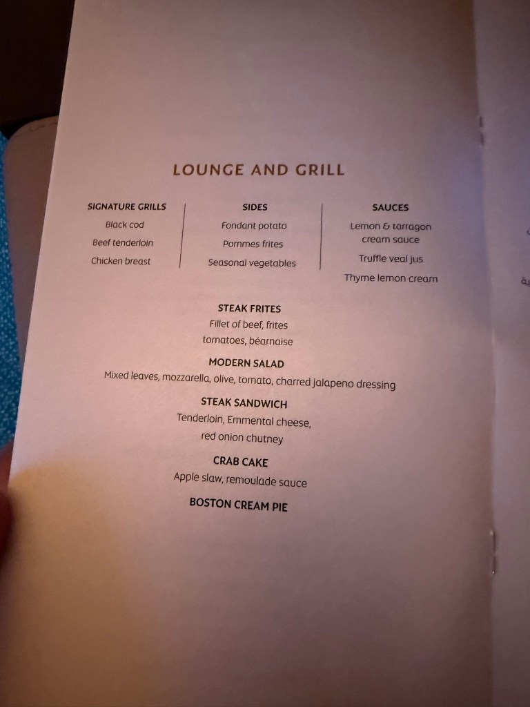I took a look at the menu as we taxied out. Etihad has a regular menu and then a lounge and grill concept where you can just basically pair any main dish with any sauce or side. Honestly, I just now noticed that they had Boston cream pie on the menu. I totally missed this!