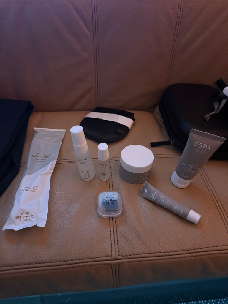 I was given an amenity kit and pajamas. I asked about the female amenity kit for my wife, but the flight attendant said they were the same. She offered me a second one, but at this point, I honestly didn’t have room in my backpack for another one. The kit came in a beautiful leather Armani bag that looked large enough to use for a tablet or small laptop. It contained ESPA amenities. I also got a code for free wifi.