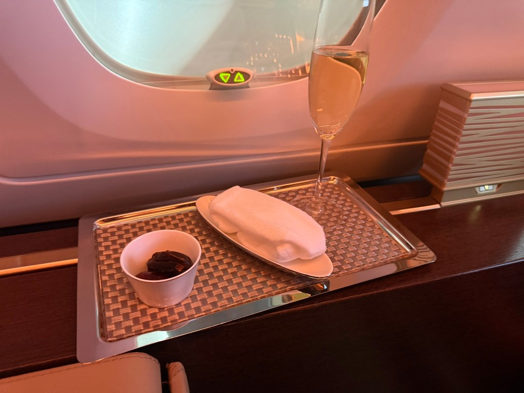 Despite the hour, I was excited for the flight and I gladly took the offer of champagne and a cold towel. It was Stenope, priced around $150-200 a bottle. Dates and Arabic coffee were also offered prior to takeoff.