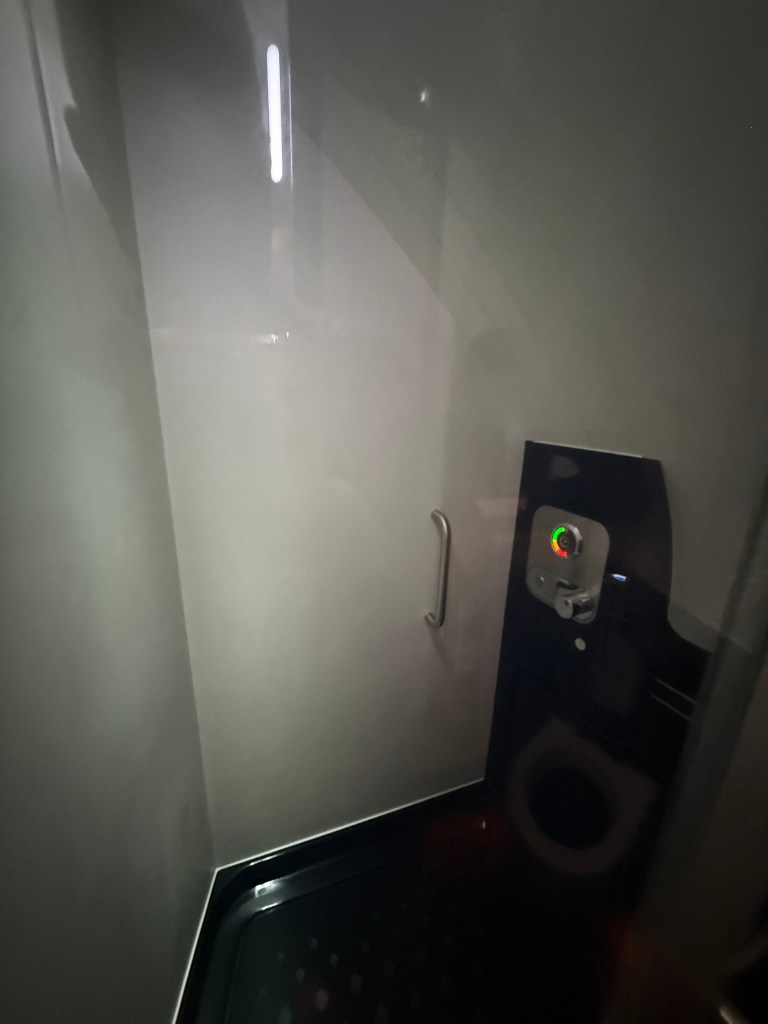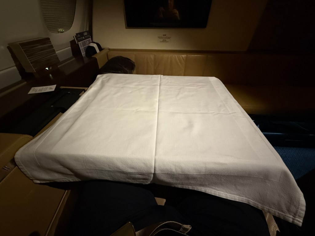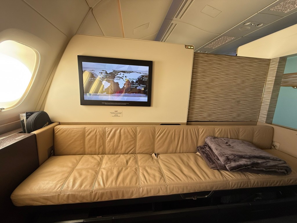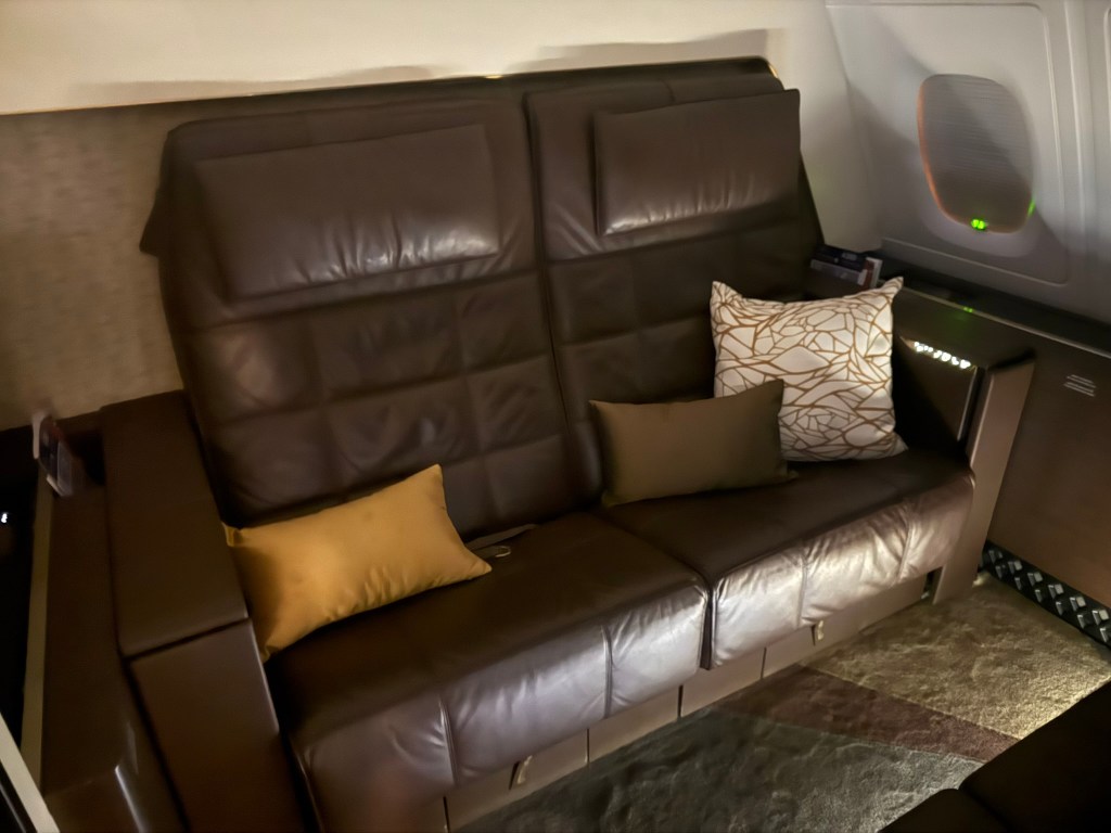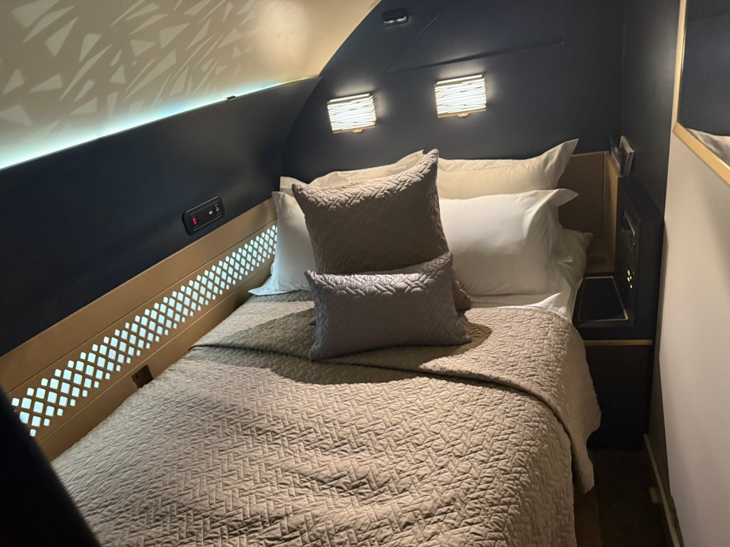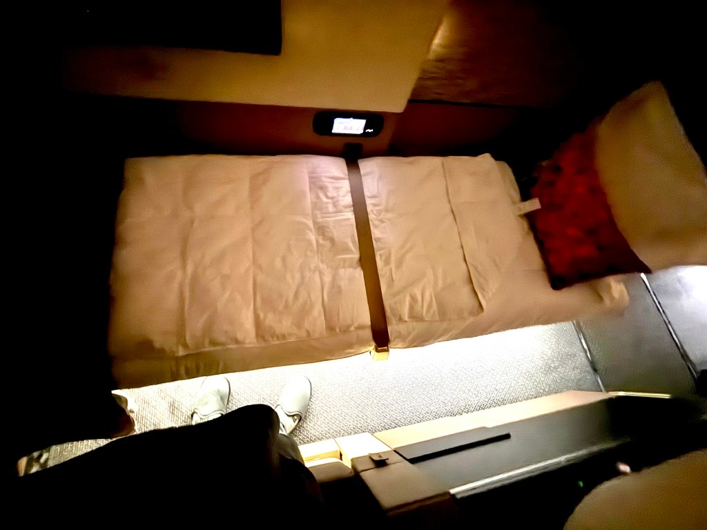 The Apartments have a lounging seat and then a long bench that turns into a bed. There are closing doors with some decorative holes in them so it’s not quite as private as Gamechanger. There’s a decent amount of storage in and around the seat although my carry-on would not fit in the space below the bench, so a flight attendant took it and placed it in business class. Thankfully, I had put a change of clothes in my backpack just in case.