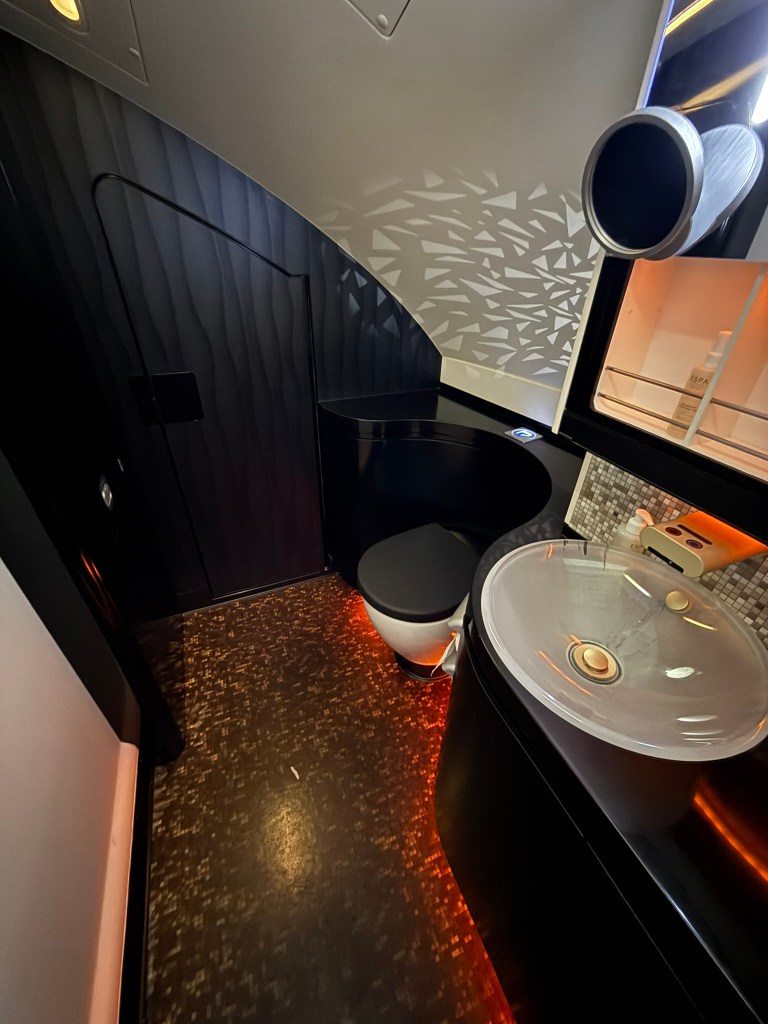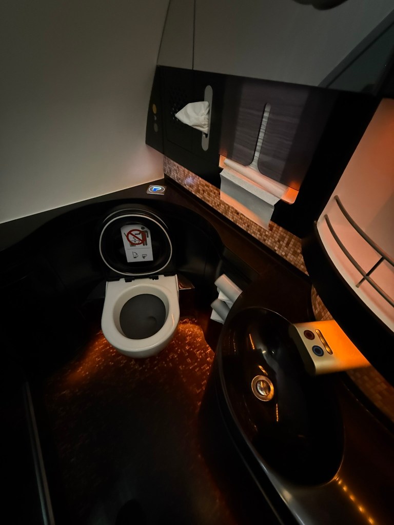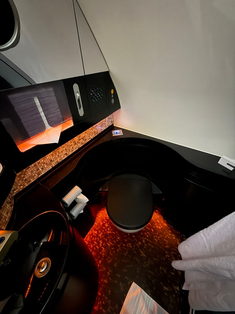 At this point, it was 3:30am or so UAE time and around 7:30pm EDT, but in my mind, it was bedtime. I went to the restroom while the flight attendant made up my bed. This was actually the restroom without the shower, so I grabbed a picture of it. As you can see, it’s quite large, but nothing compared to those on Qatar and Emirates.