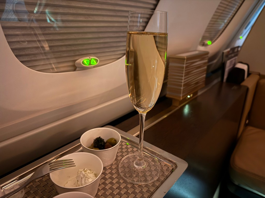 We were wheels up at 2:54am local time and fairly soon some more champagne was brought around with olives, cheese and nuts. As you can guess if you’ve read the rest of this trip report, I skipped the olives.