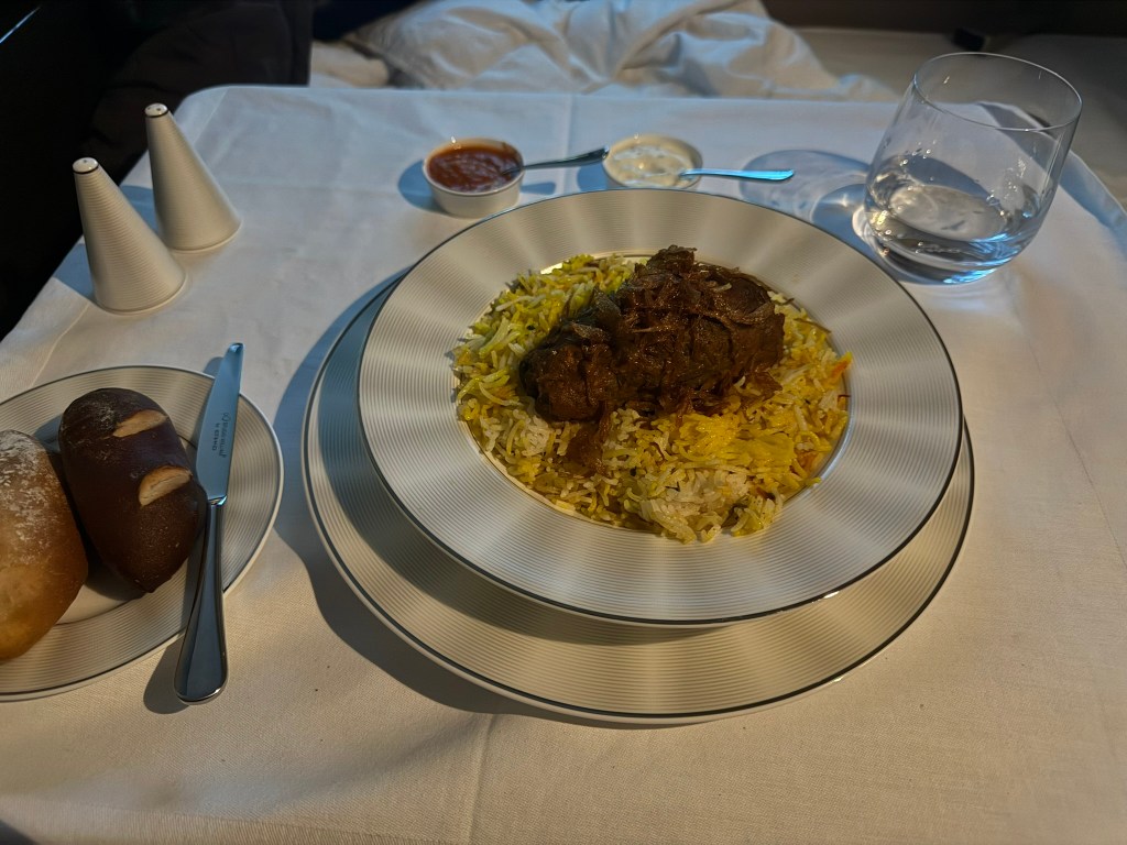 I moved on to my main course, the lamb shank nandi, which actually turned out to be very good. It was served with a spicy sauce and a yogurt sauce along with bread. As you can see, when it first arrived, I was missing silverware which the flight attendant hurried to bring me when I pointed it out.