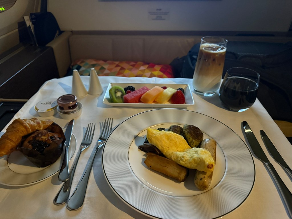 After I was back in my seat, it was breakfast time. I started with fruit and pastries, then had the omelet. I also got some sort of charcoal drink that was supposed to be good for my stomach (it didn’t taste great) and an iced latte.