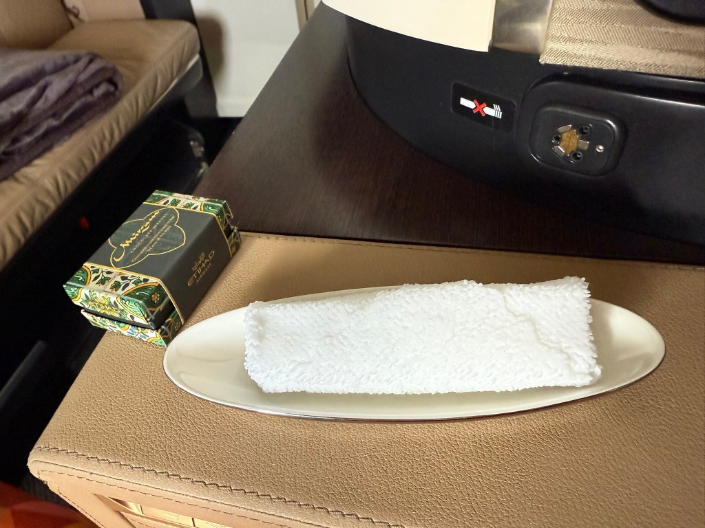 The breakfast was really tasty and the omelet was freshly made. At this point, we had an hour or so left in the flight and they brought around a warm towel and some chocolates. My bed was turned back into the bench.