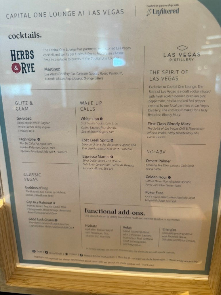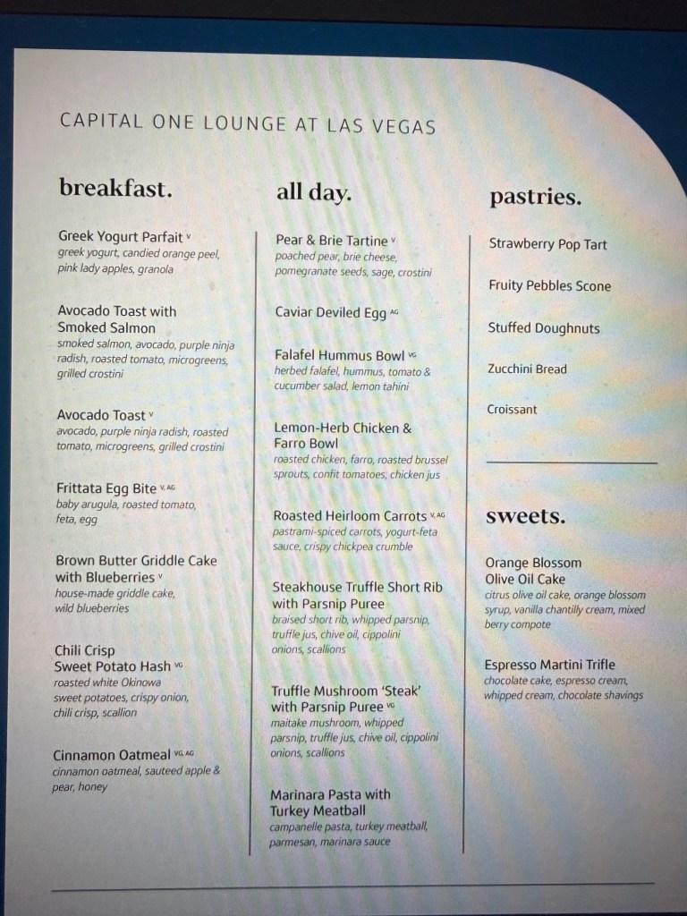 I really enjoyed the Capital One Lounge Las Vegas. Compared to the Chase and Amex lounges I’ve been to, all of the Capital One Lounges have better food and are at least equal if not better in their beverage program. Probably due to the smaller footprint, the Vegas lounge is not as unique and interesting as the JFK lounge, but I would definitely score it way ahead of the nearby Amex Centurion Lounge. My wife and I will be passing through Vegas in March so I look forward to being back in the Capital One Lounge again fairly soon.