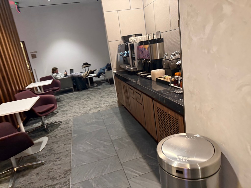 There were plenty of seats available at that hour although the last time I was here in 2021 in the middle of the day, the lounge was absolutely jam-packed. It’s one of the older designs for Centurion with walls separating the seating areas. That keeps the noise down, but doesn’t really use space efficiently. There’s also a drink station with coffee, tea and water for those who don’t want to wait at the bar.
