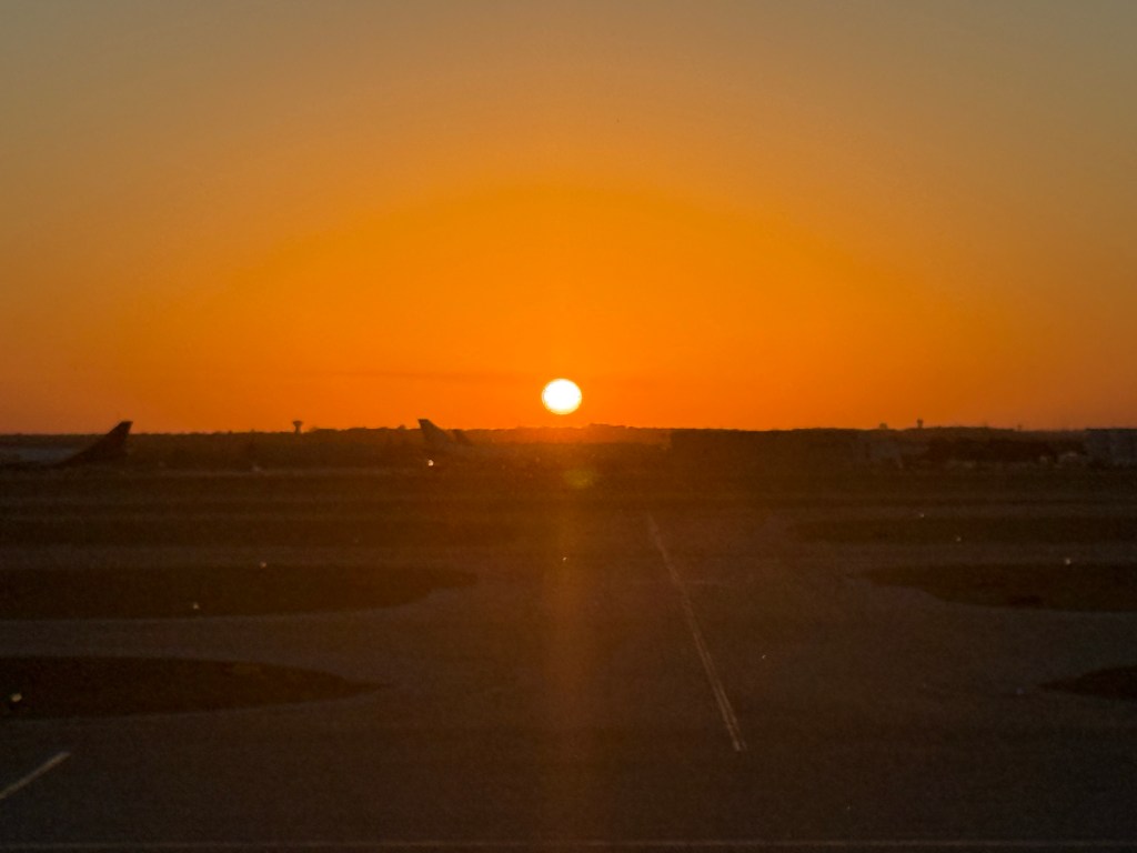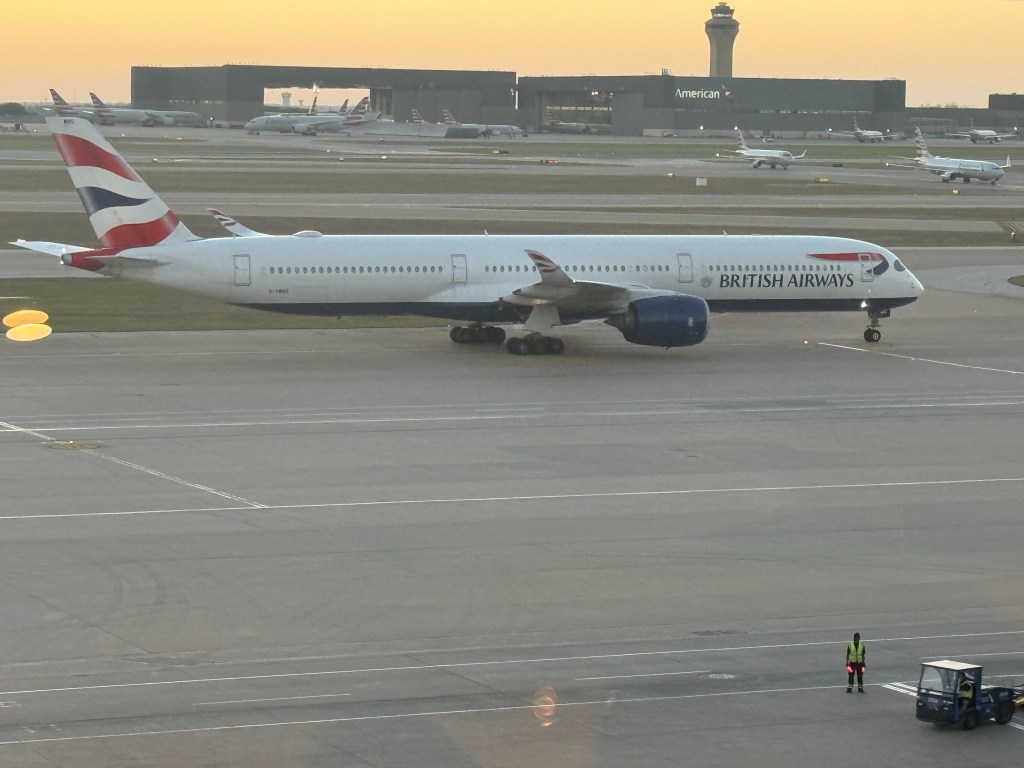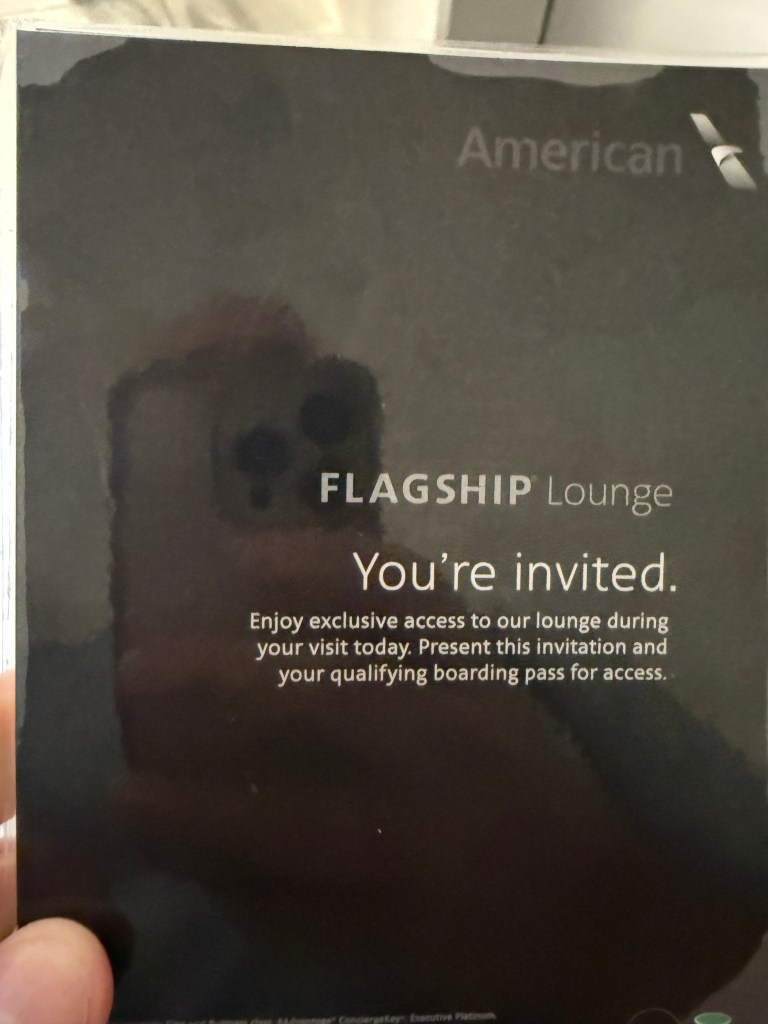 We then walked about halfway around the concourse to check in with American. Thankfully, they also had a check-in area in Concourse E so we could shed our bags again and go through security there. We were lucky as things were also quiet at DFW that time of day. We took the SkyLink over to Concourse D and found the AA Flagship Lounge. We had access through our AA business class tickets. I can’t believe that in 2026, after Covid, AA still thinks it makes sense to have these silly laminated lounge passes to get into the Flagship Lounge.