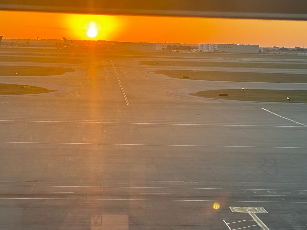 I grabbed some Piper-Heidseck champagne which was being poured back near the entrance and settled into our seats. At some point, the window screens were raised and we were treated to a great Dallas/Fort Worth sunset.