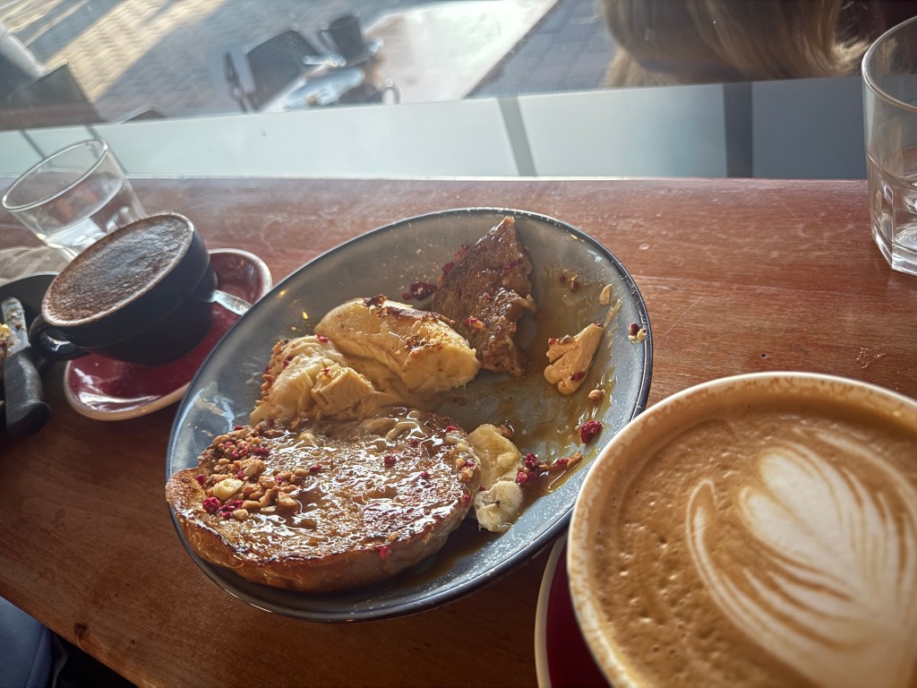 The next morning after a decent night’s sleep (except for me randomly waking up at 3am, checking the ongoing Liverpool match and seeing them lose before going back to sleep), we went to Belle, a coffee shop on nearby New Regent Street. We had some good coffee and a ridiculously indulgent peanut butter caramel banana bagel thing.